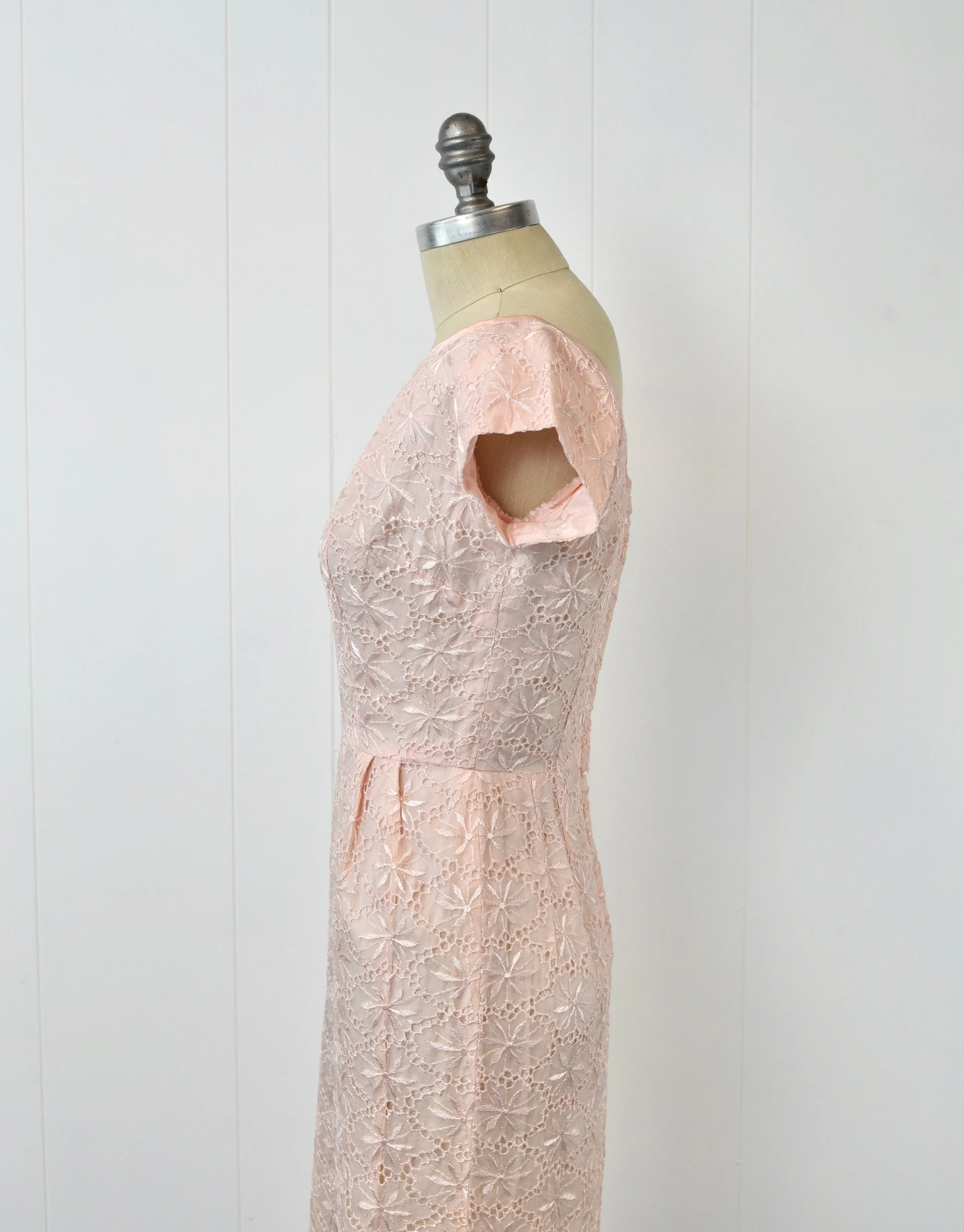 1950s Ballet Baby Pink Floral Embroidered Lace Lattice Pencil Wiggle Pinup Dress