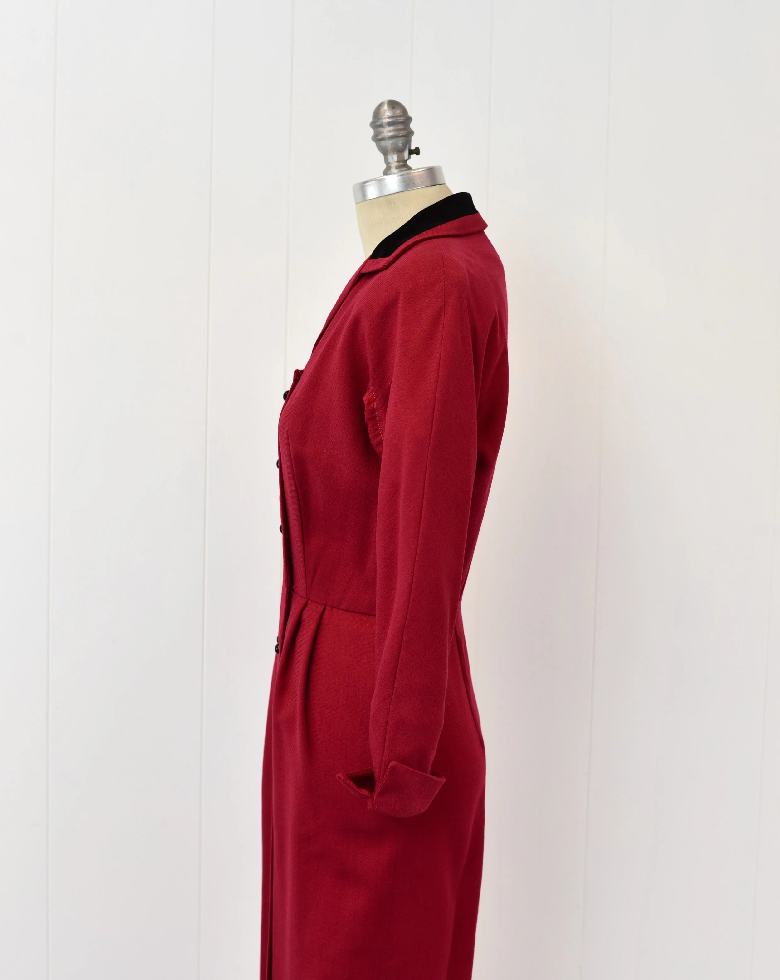 1950s Berry Red Wool Black Velvet Mid Century Day Dress