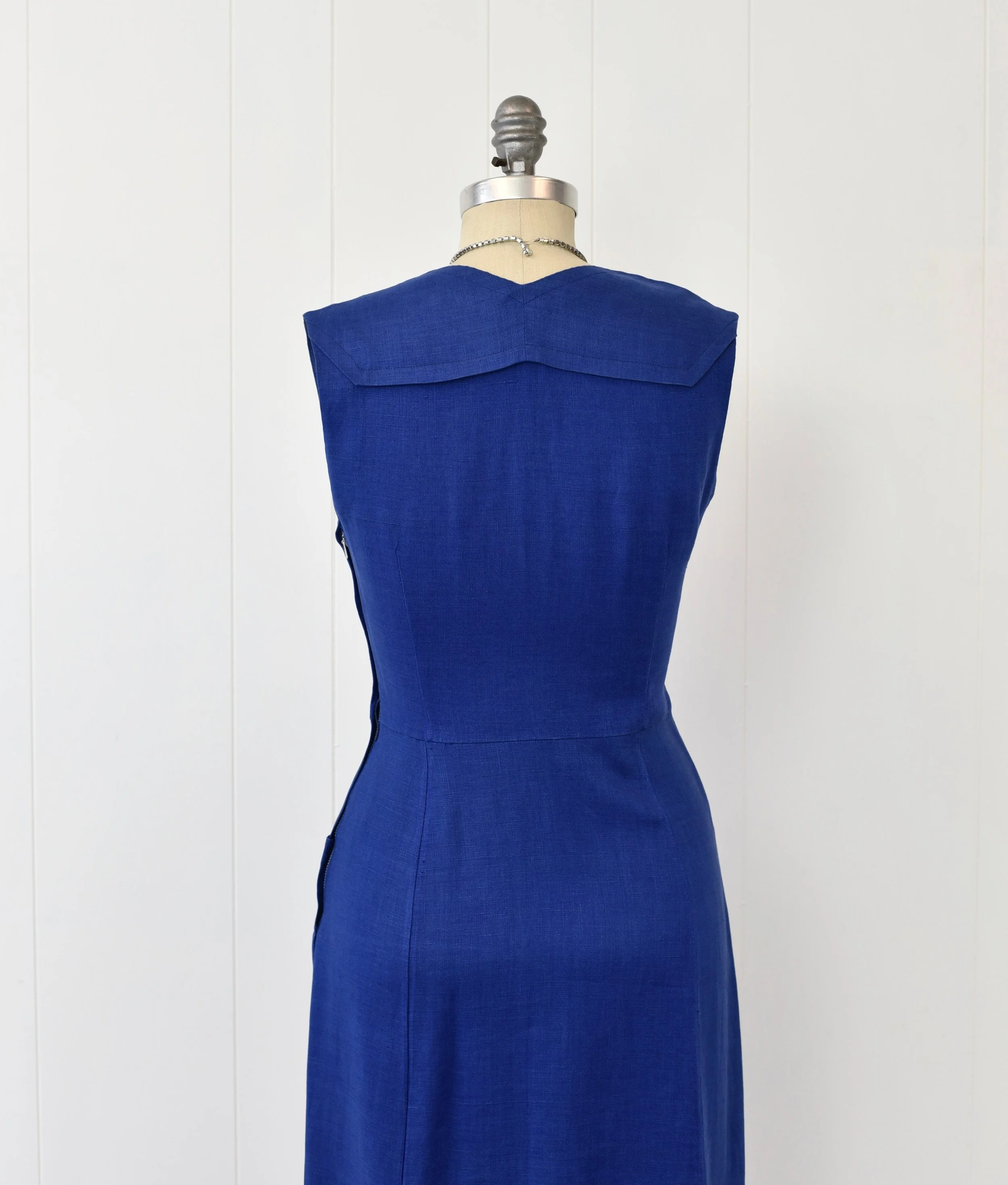 1950s Carlye Royal Blue Linen Pinup Wiggle Pencil Cocktail Dress
