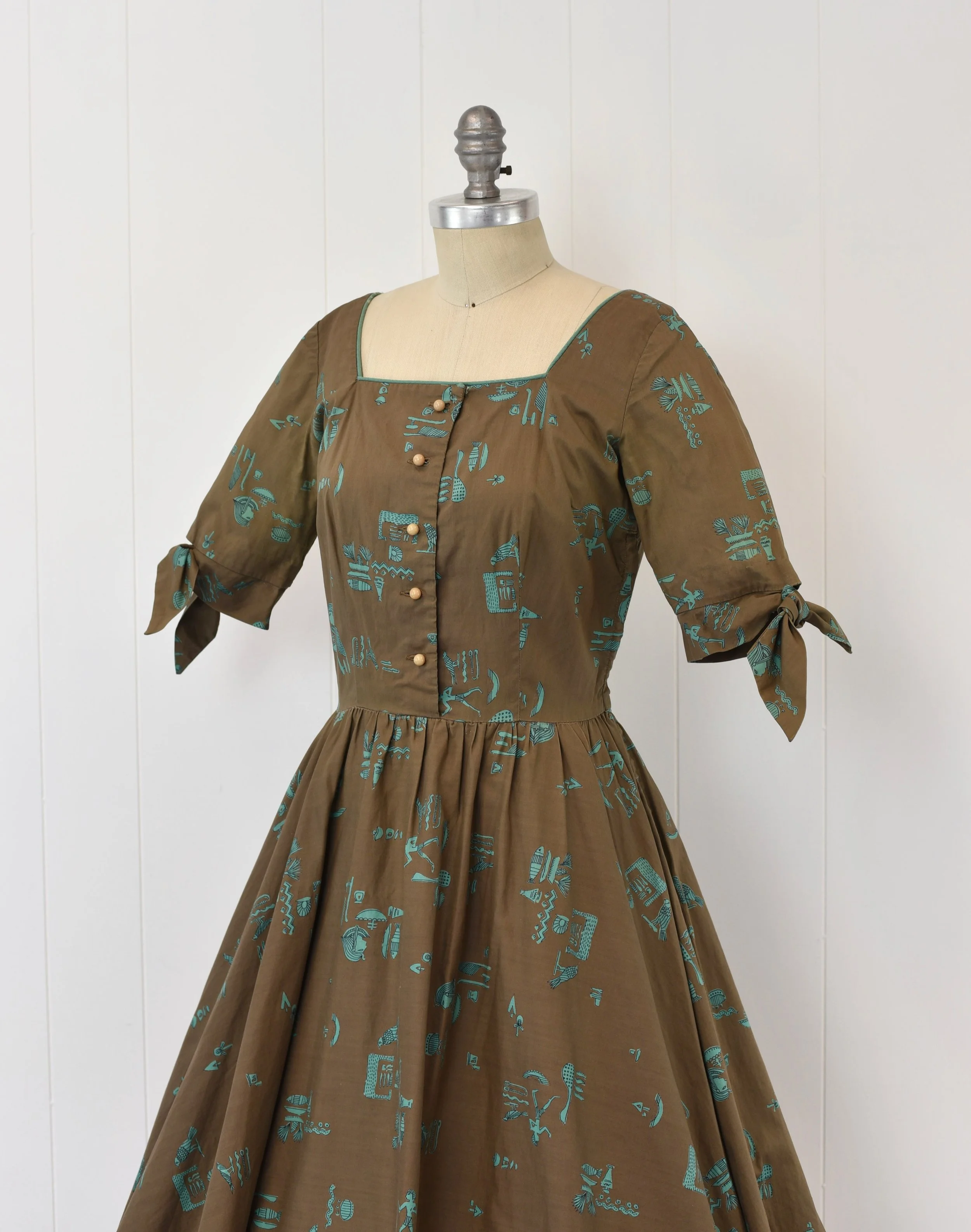 1950s Egyptian Novelty Print Brown Teal Cotton Parade New York Pinup Dress
