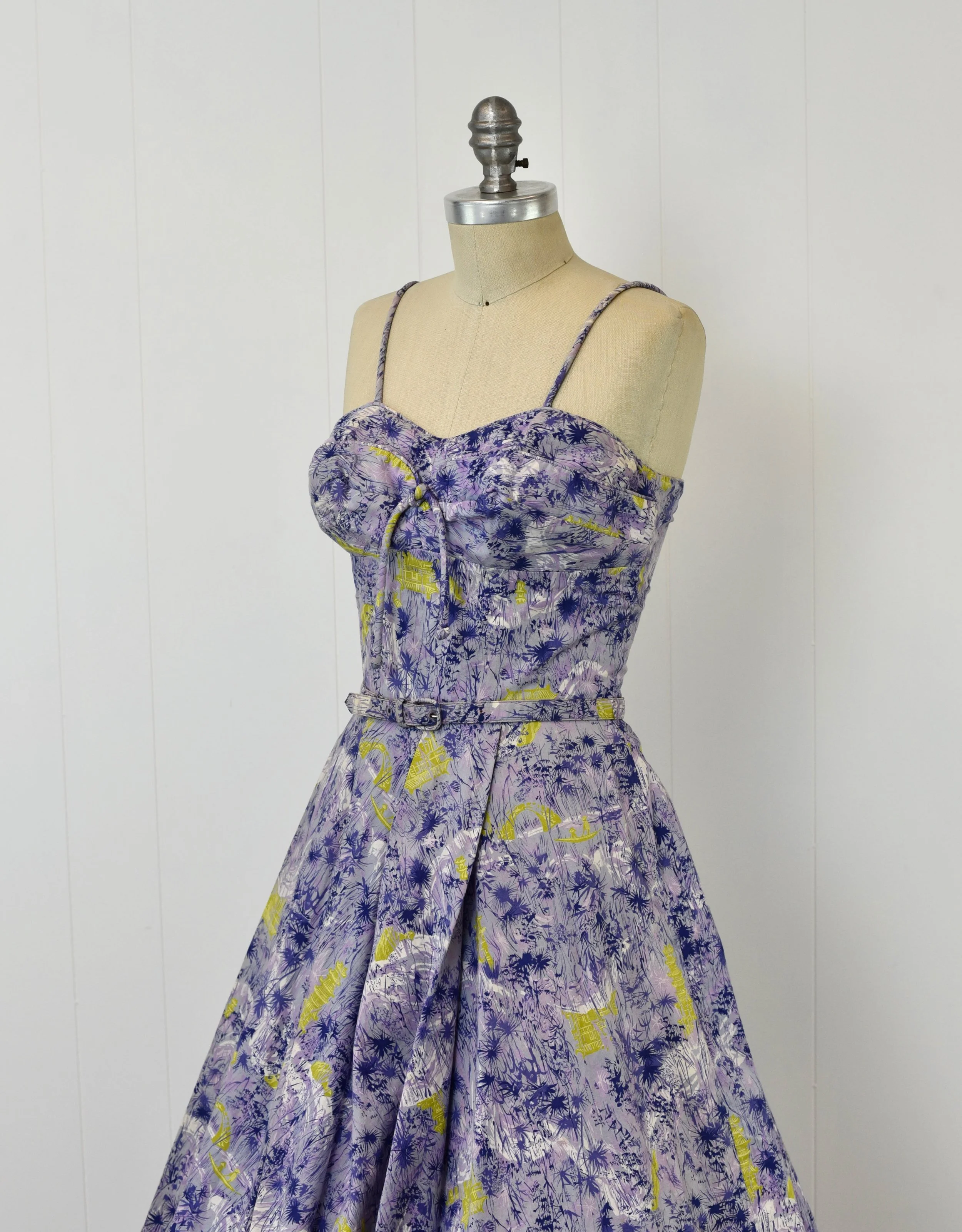 1950s Purple Novelty Print Asian Inspired Chartreuse Colony Casuals of California Pinup Sun Dress