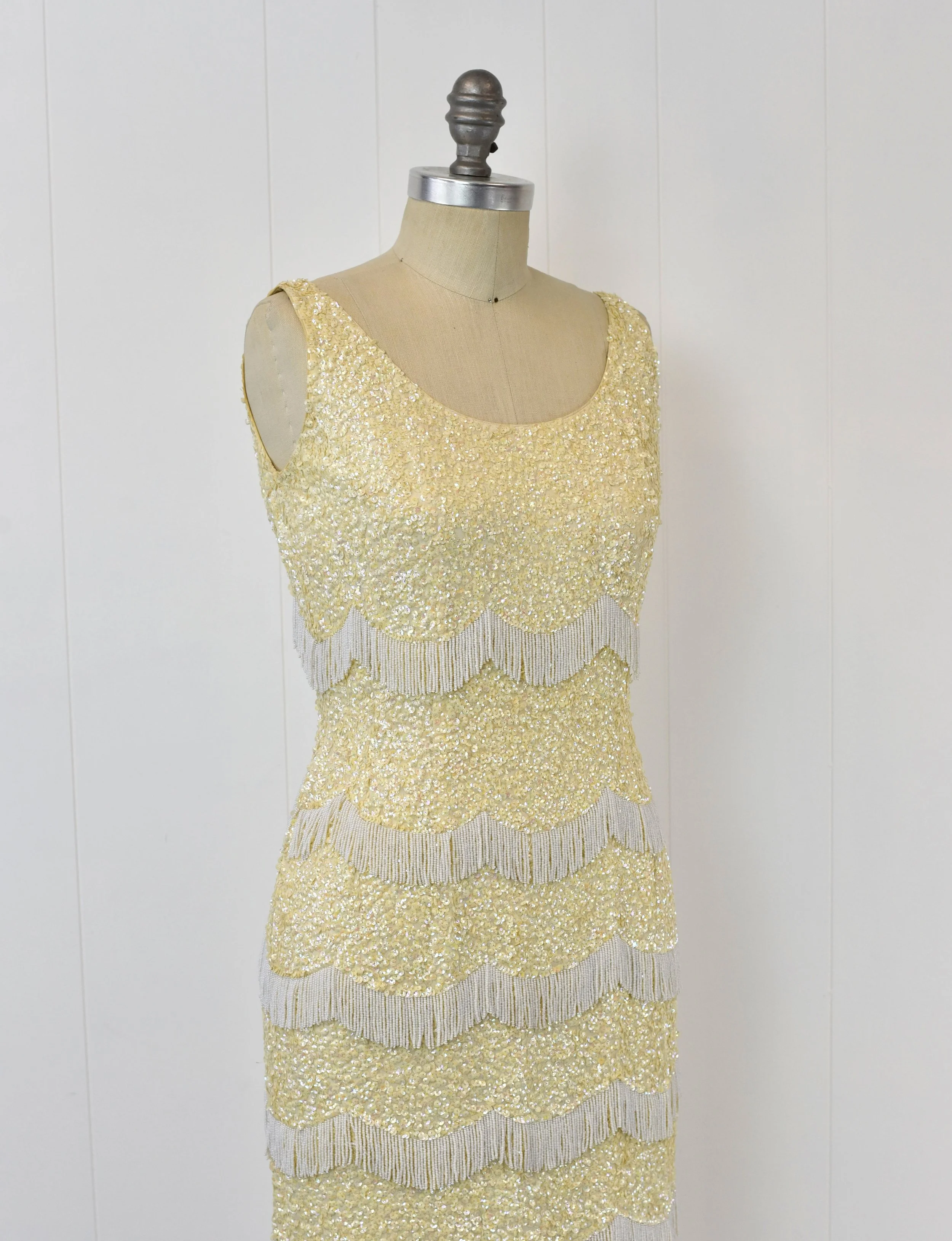 1950s/1960s Bombshell Cream Ivory AB Sequin Beaded Fringe Wiggle Pinup Bridal Wedding Party Dress