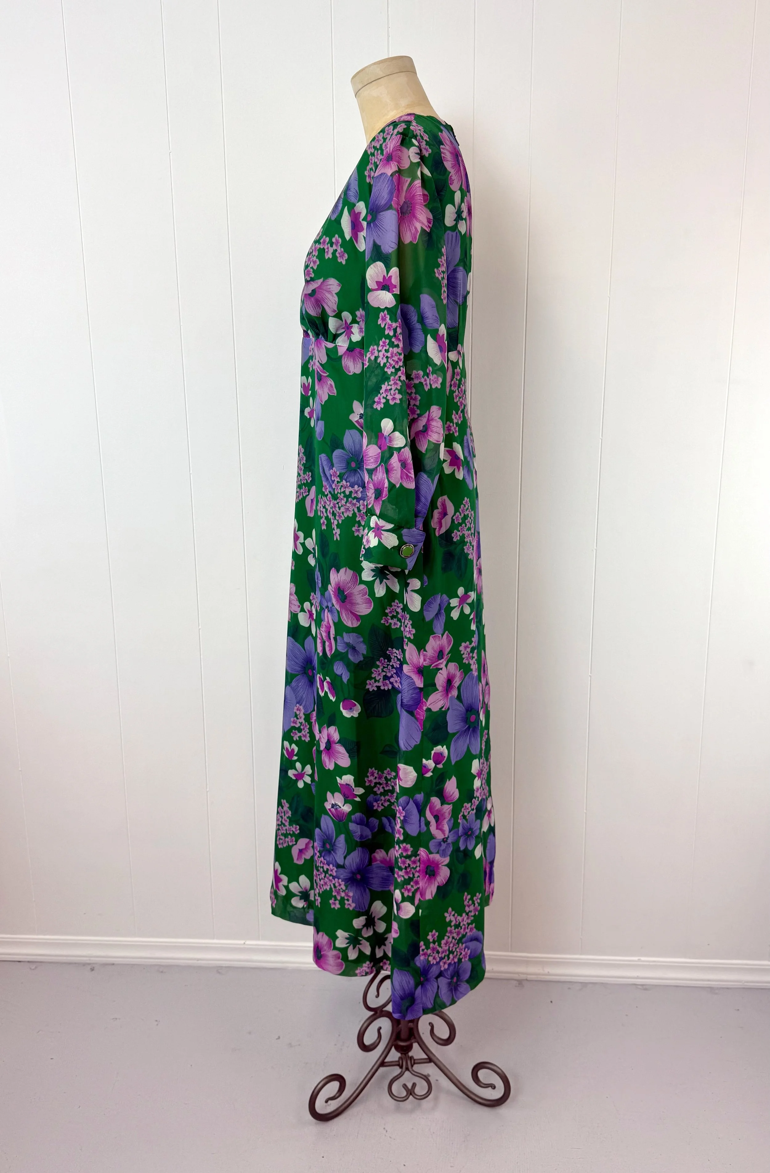 1970s Floral Print Green Purple Estrella Modell Balloon Sleeve Disco Party Boho Maxi Dress Gown Volup