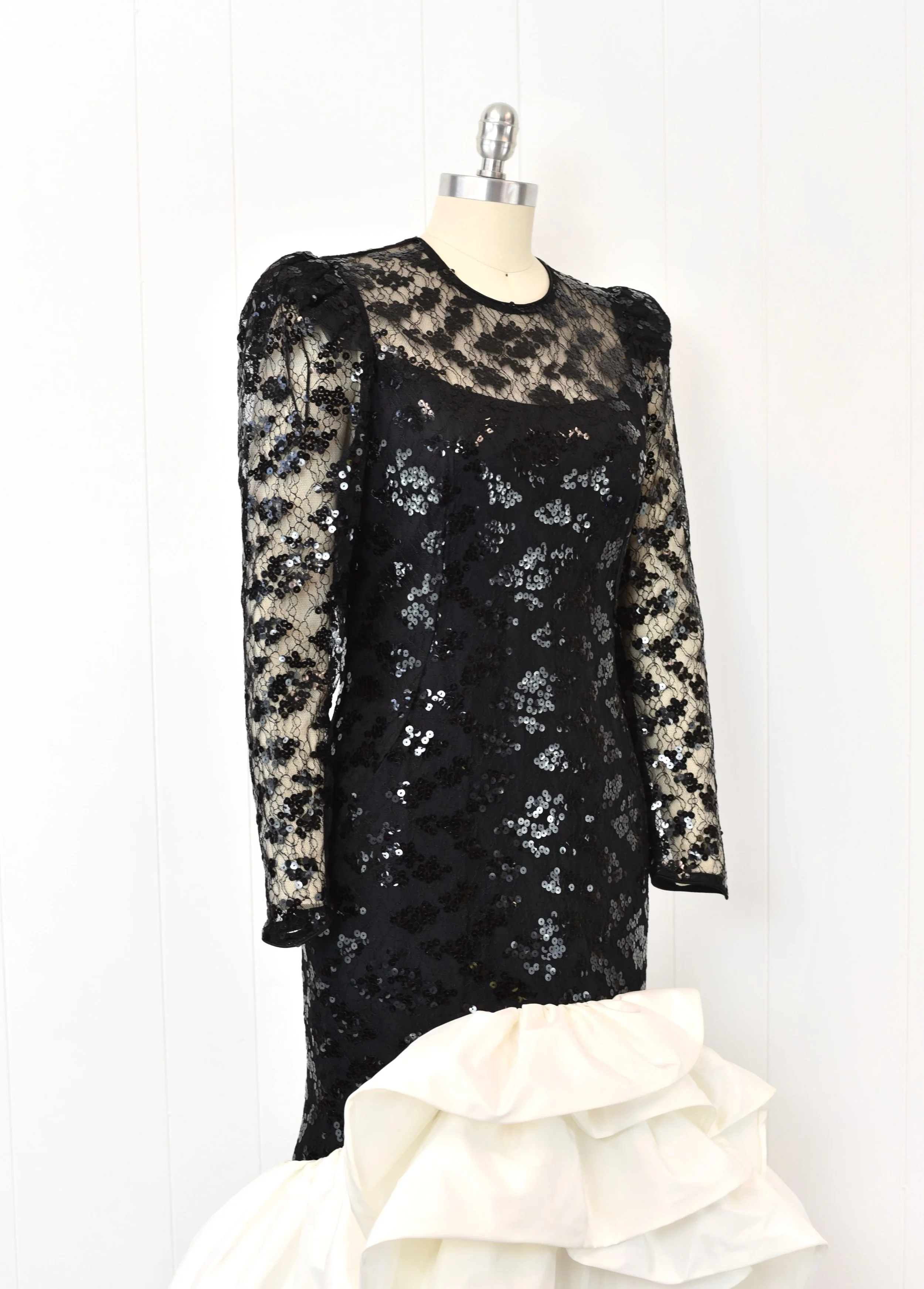 1980s Black White Sequin Tulle Lace Ruffled After Five by Julie Duroche Party Maxi Mermaid Dress Gown
