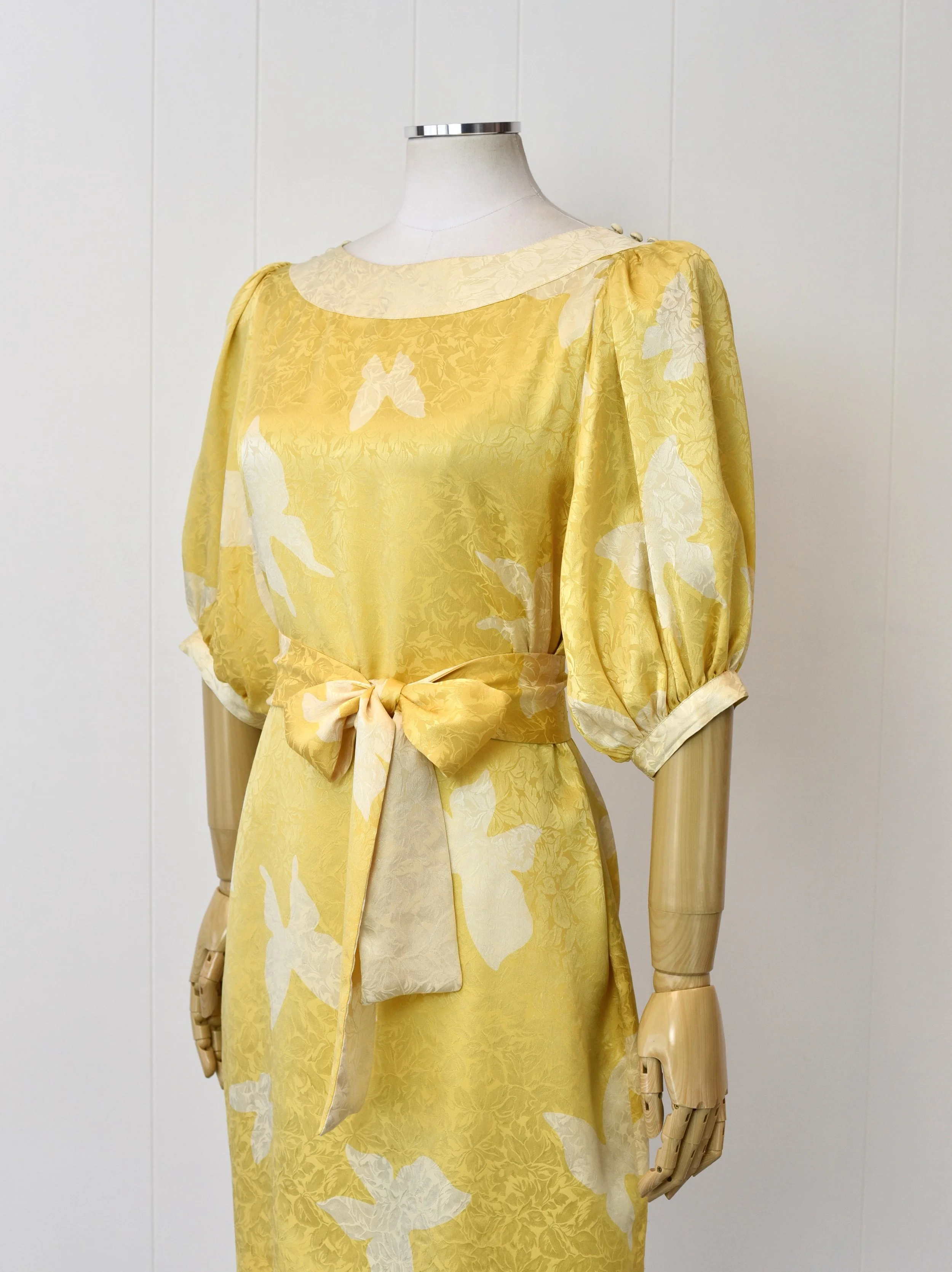 1980s/1990s Flora Kung Yellow Silk Butterfly Floral Botanical Novelty Print Dress