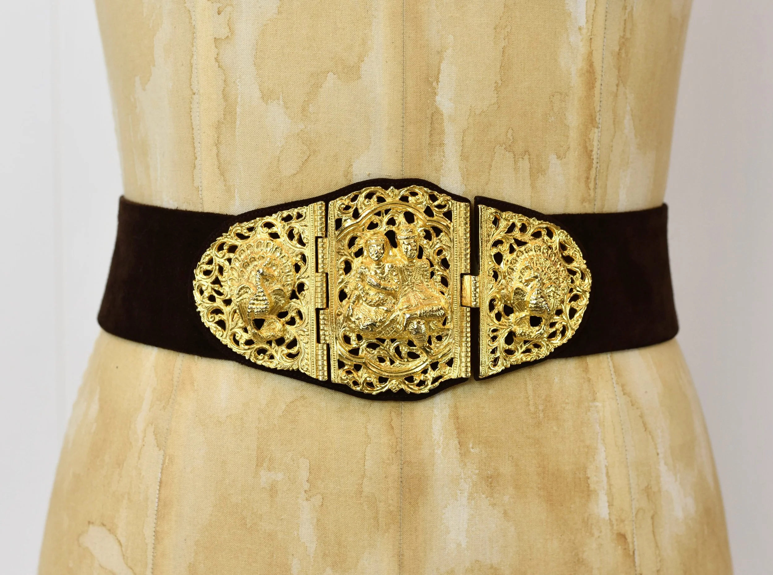 1980s Judith Leiber Brown Suede Leather Gold Peacock Indian Buddha Statement Belt