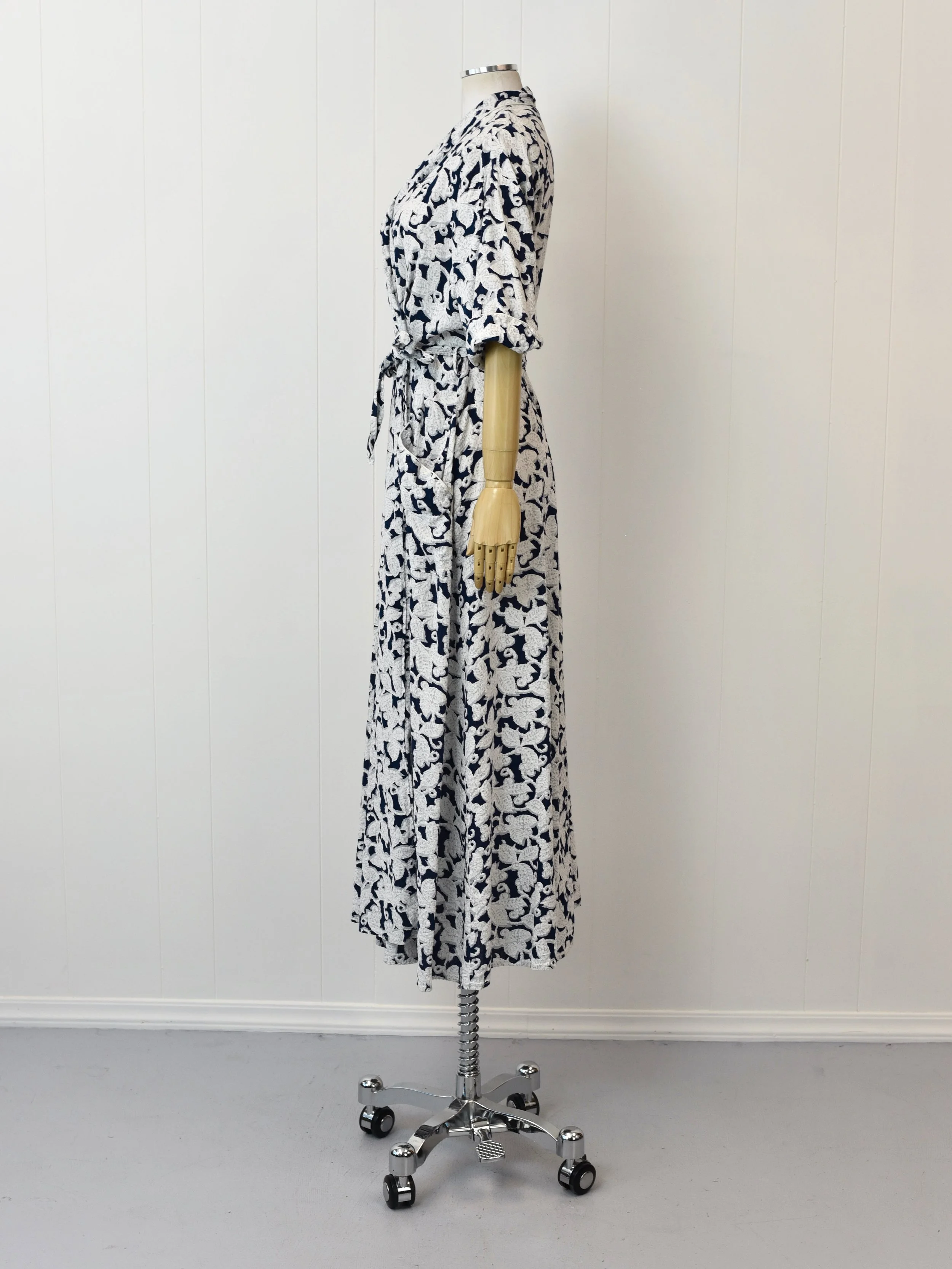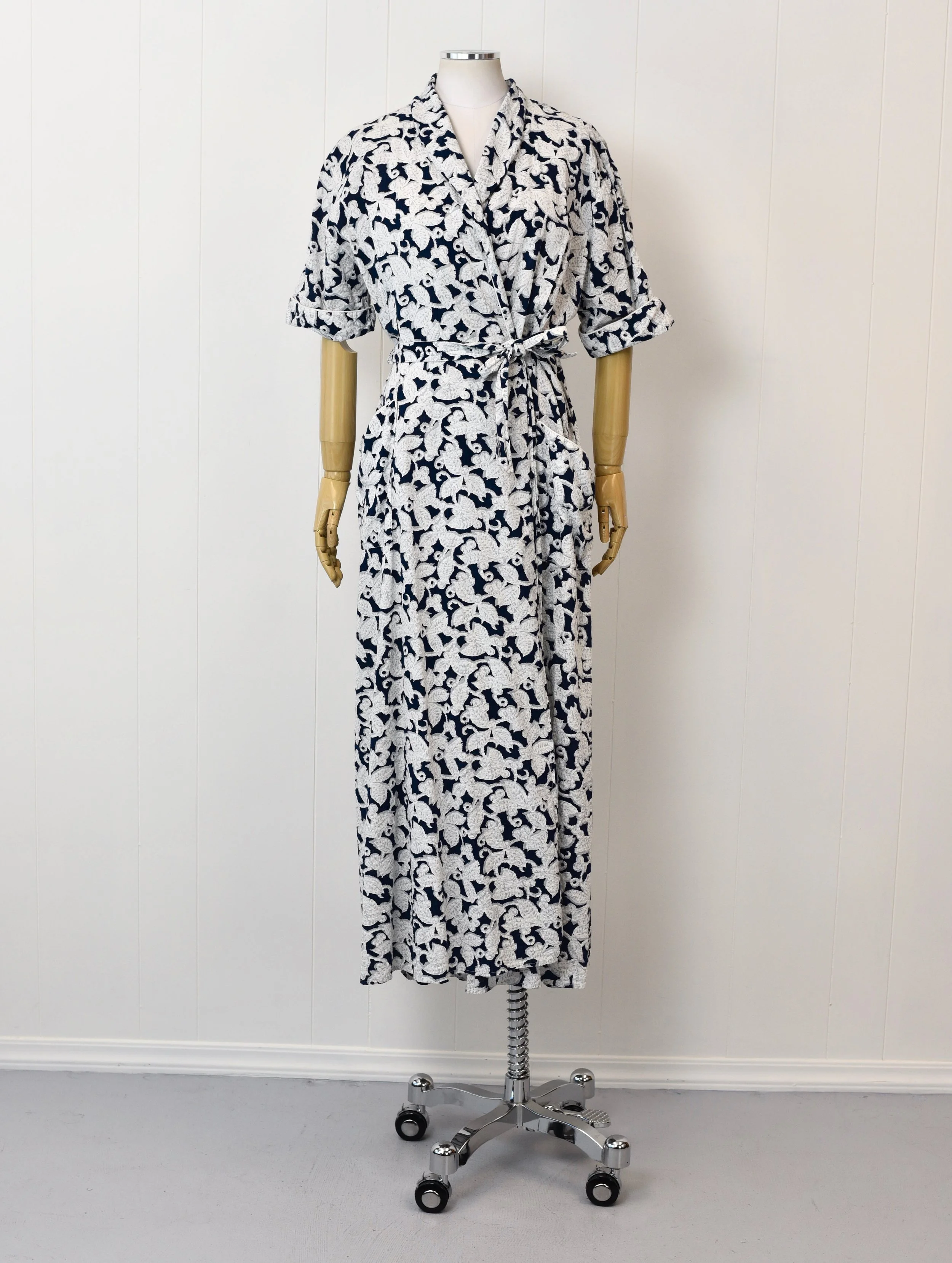 1940s Lady Chesterfield Blue & White Leaves Botanical Novelty Print Cotton Robe Loungewear Lingerie
