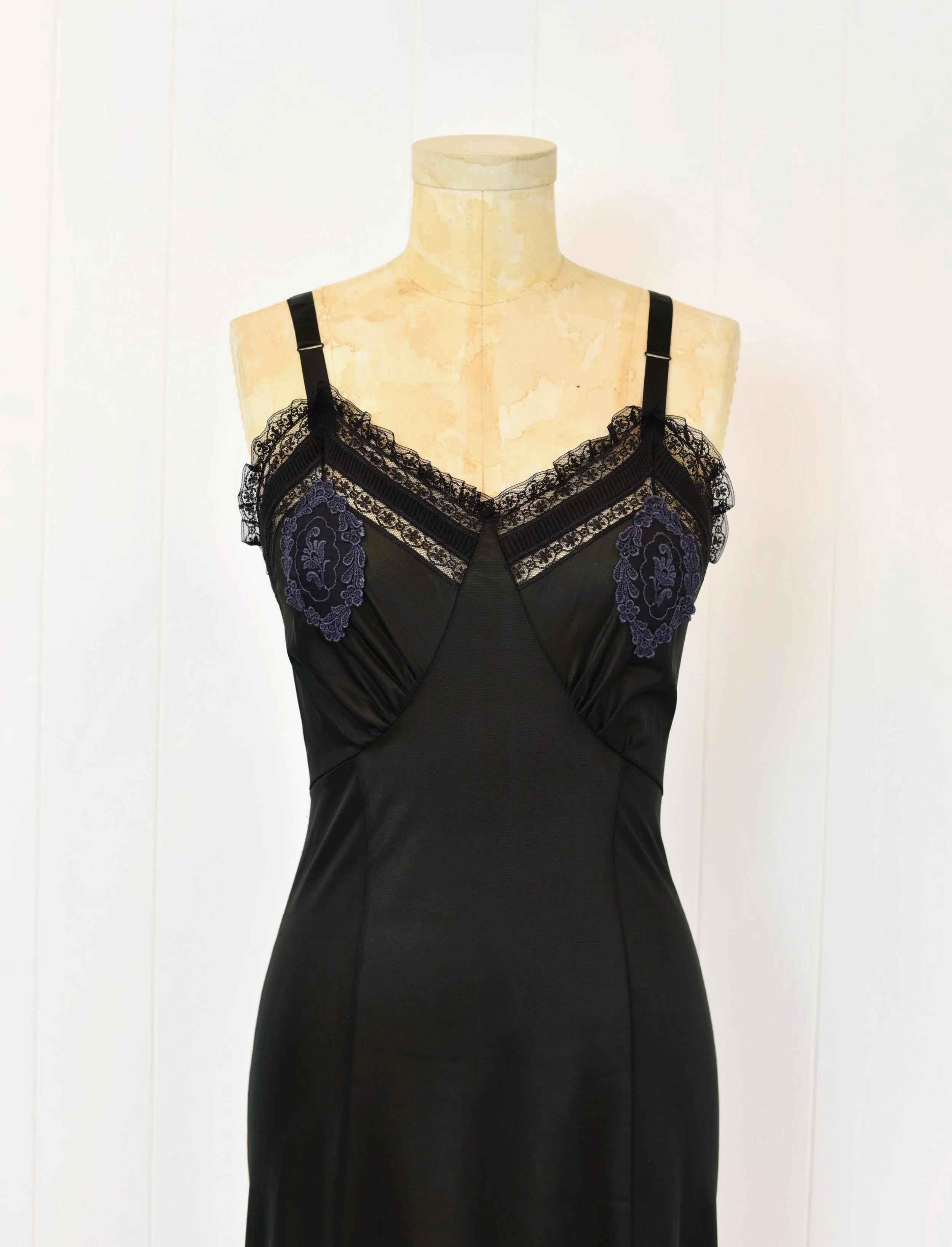 1950s Black Lace Nylon Blue Risque Floral Applique Nan Flower Boudoir Lingerie Slip Dress Nightgown