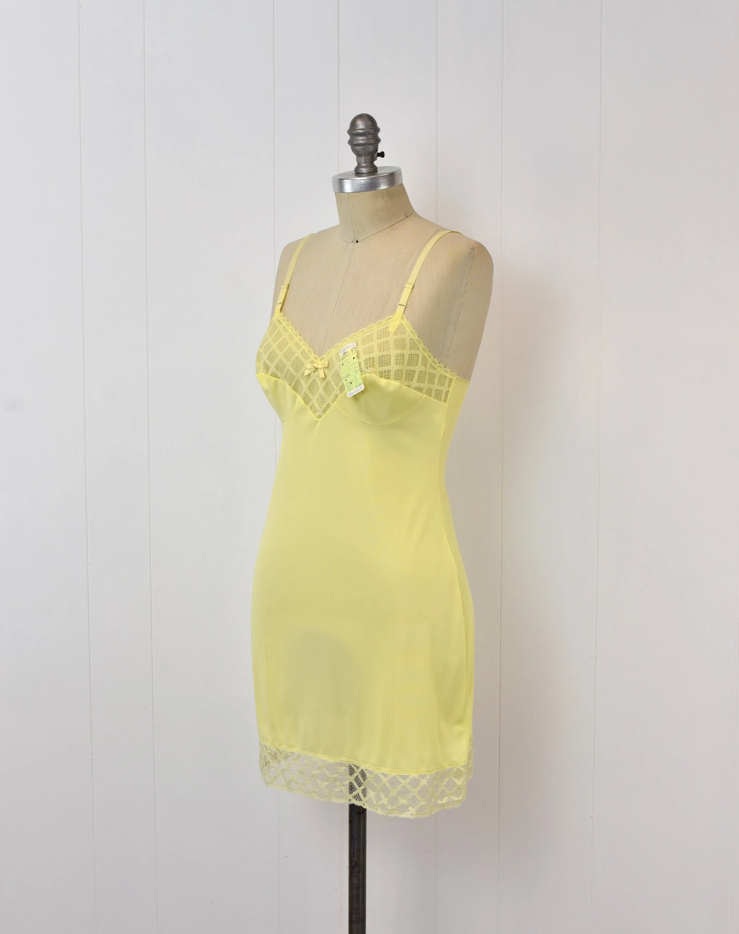 NOS 1960s Pastel Light Yellow Lattice Lace Warner Nylon Lingerie Boudoir Slip Dress