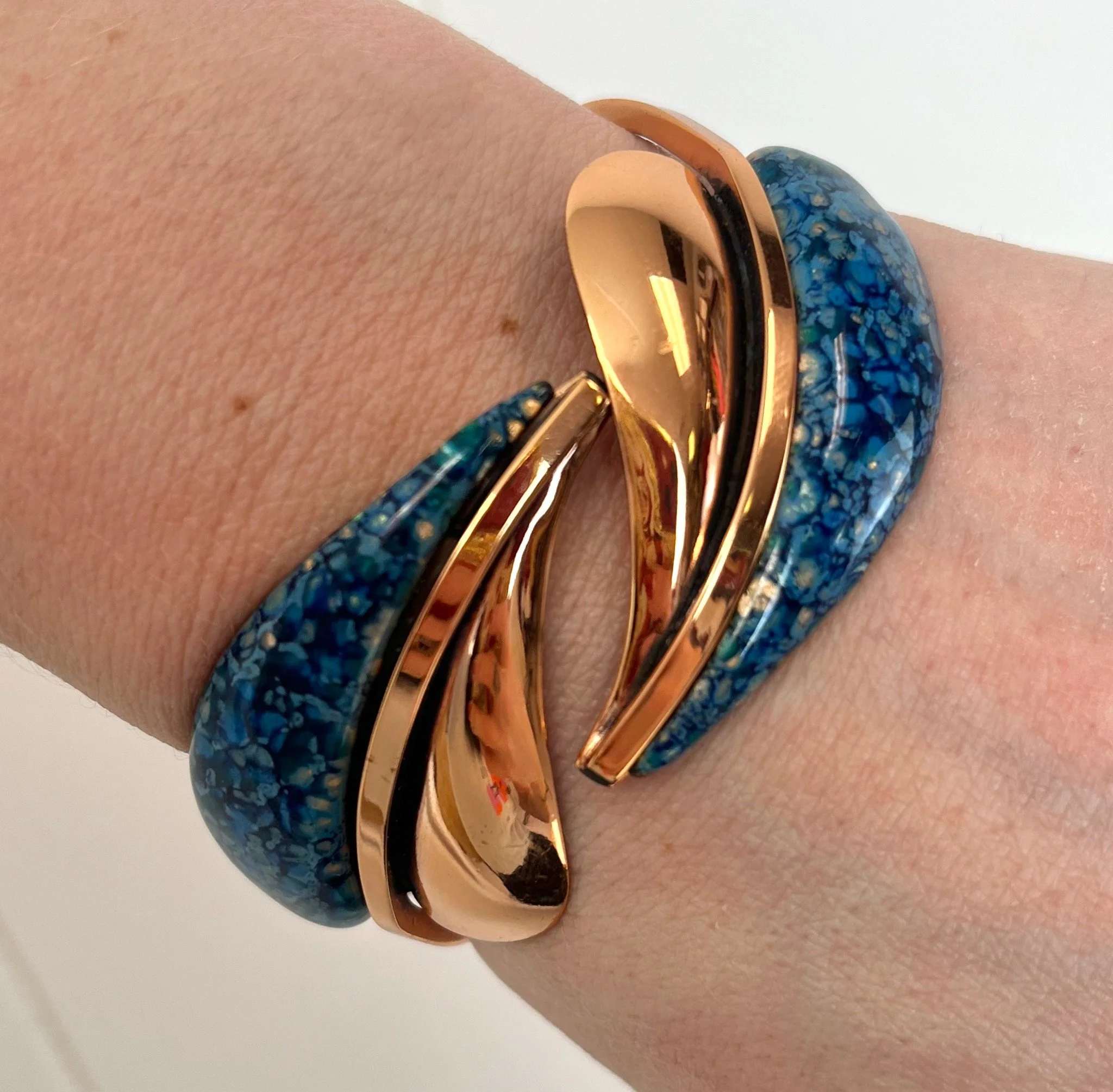 1950s Matisse Renoir Copper Blue Enamel Leaf Botanical Novelty Mid Century Statement Hinge Clamper Bracelet Jewelry Signed