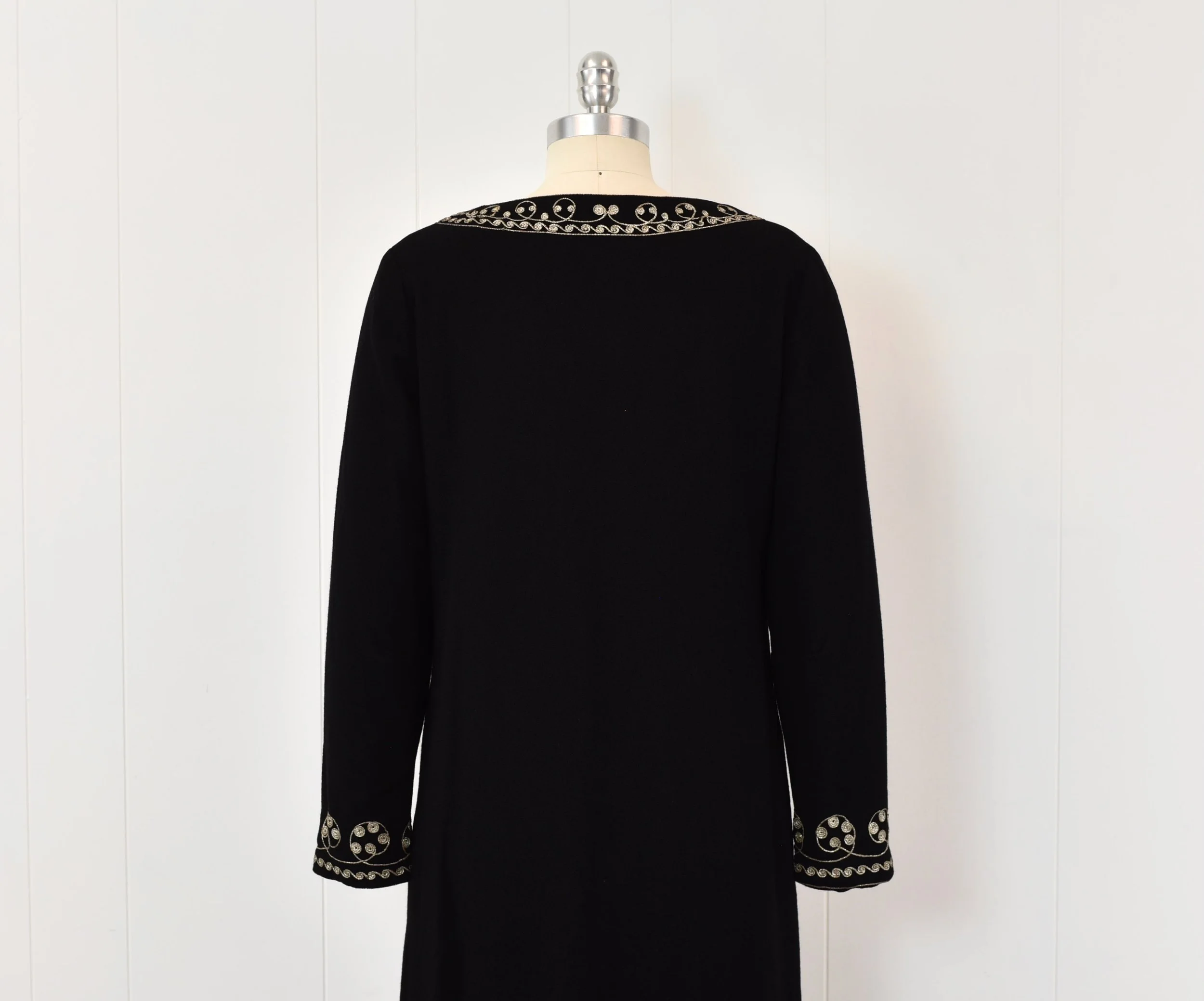 1960s Henri Bendel Black Wool Metallic Goldwork Maxi Dress