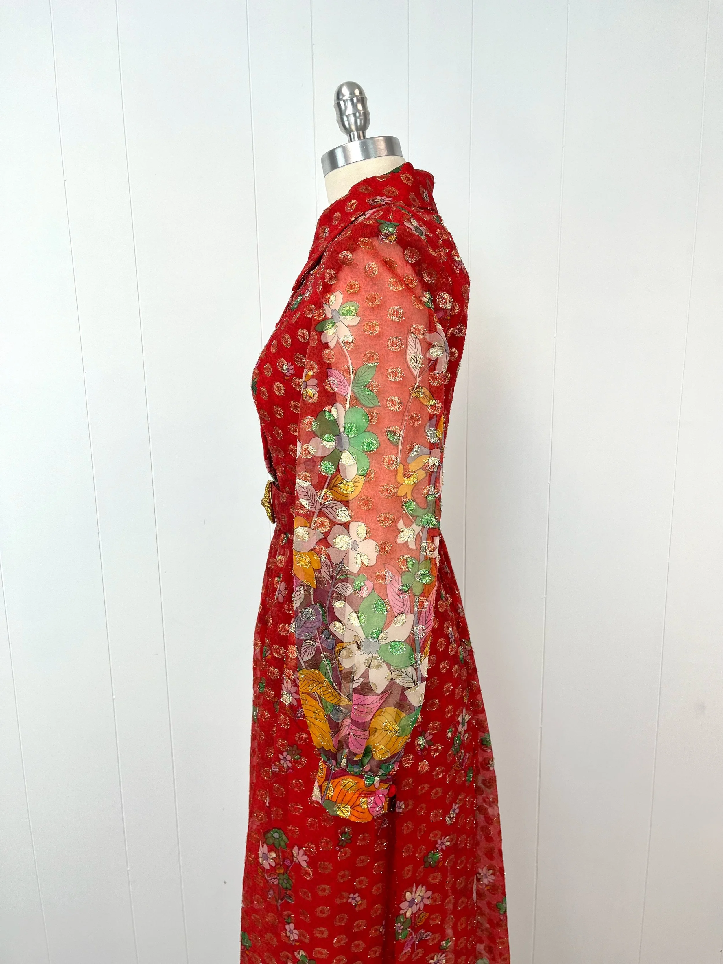 1960s/1970s Oscar de la Renta Red Metallic Gold Floral Psychedelic Rhinestone Belt Palm Royale Maxi Dress Gown