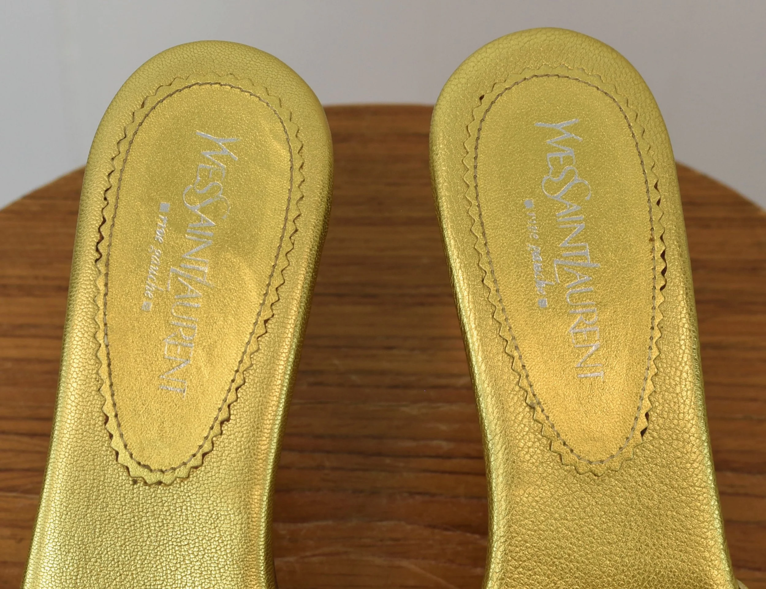 Early 2000s Yves Saint Laurent Rive Gauche Tom Ford Era Gold Metallic Leather Wood Nadja Rosette Heels Mules 37