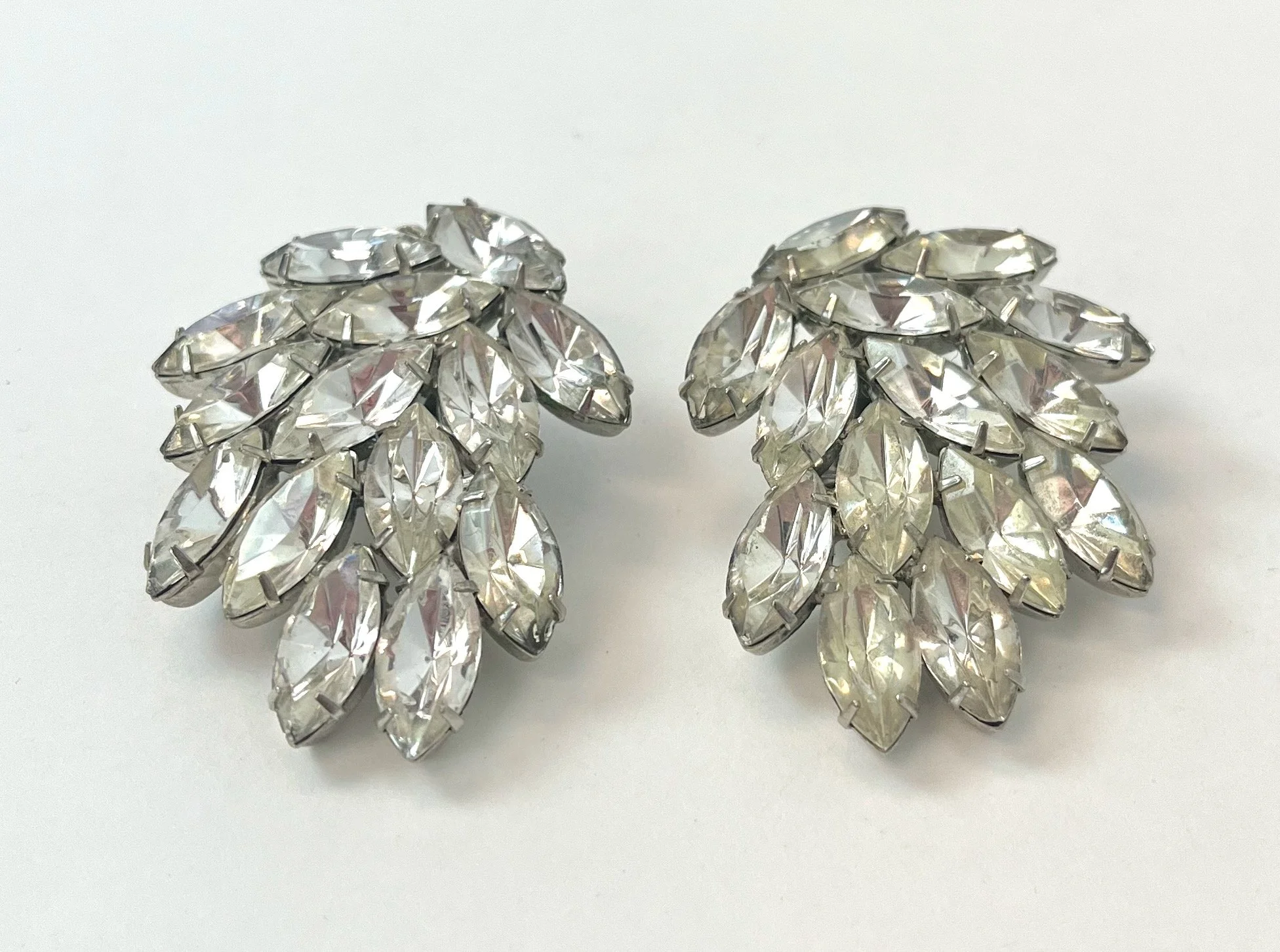 1980s Thelma Deutsch Rhinestone Cluster Silver Clip On Pair Statement Earrings Costume Jewelry Signed