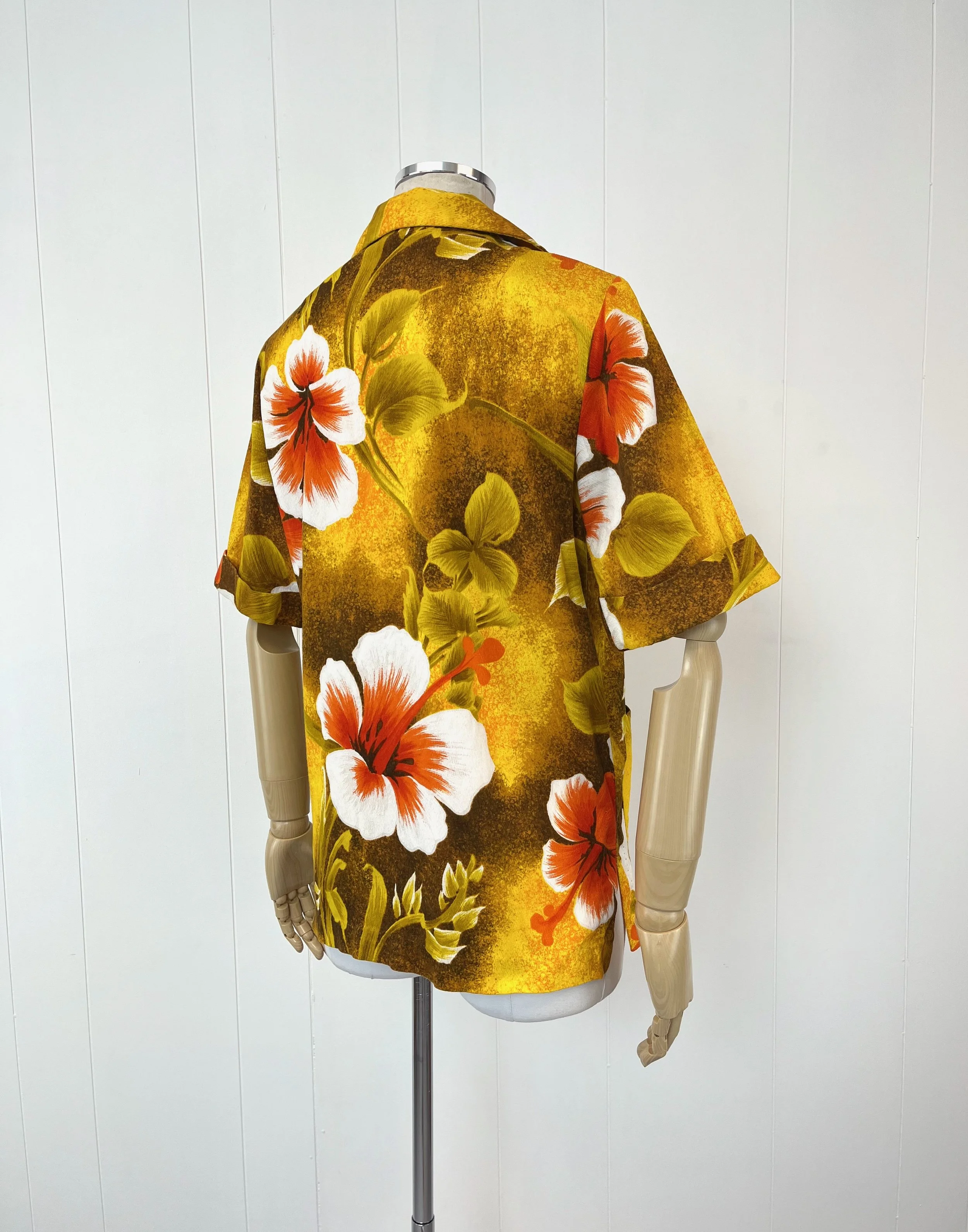 1960s Richard Douglas Hawaiian Hibiscus Floral Print Yellow Brown Tea Timer Blouse Shirt