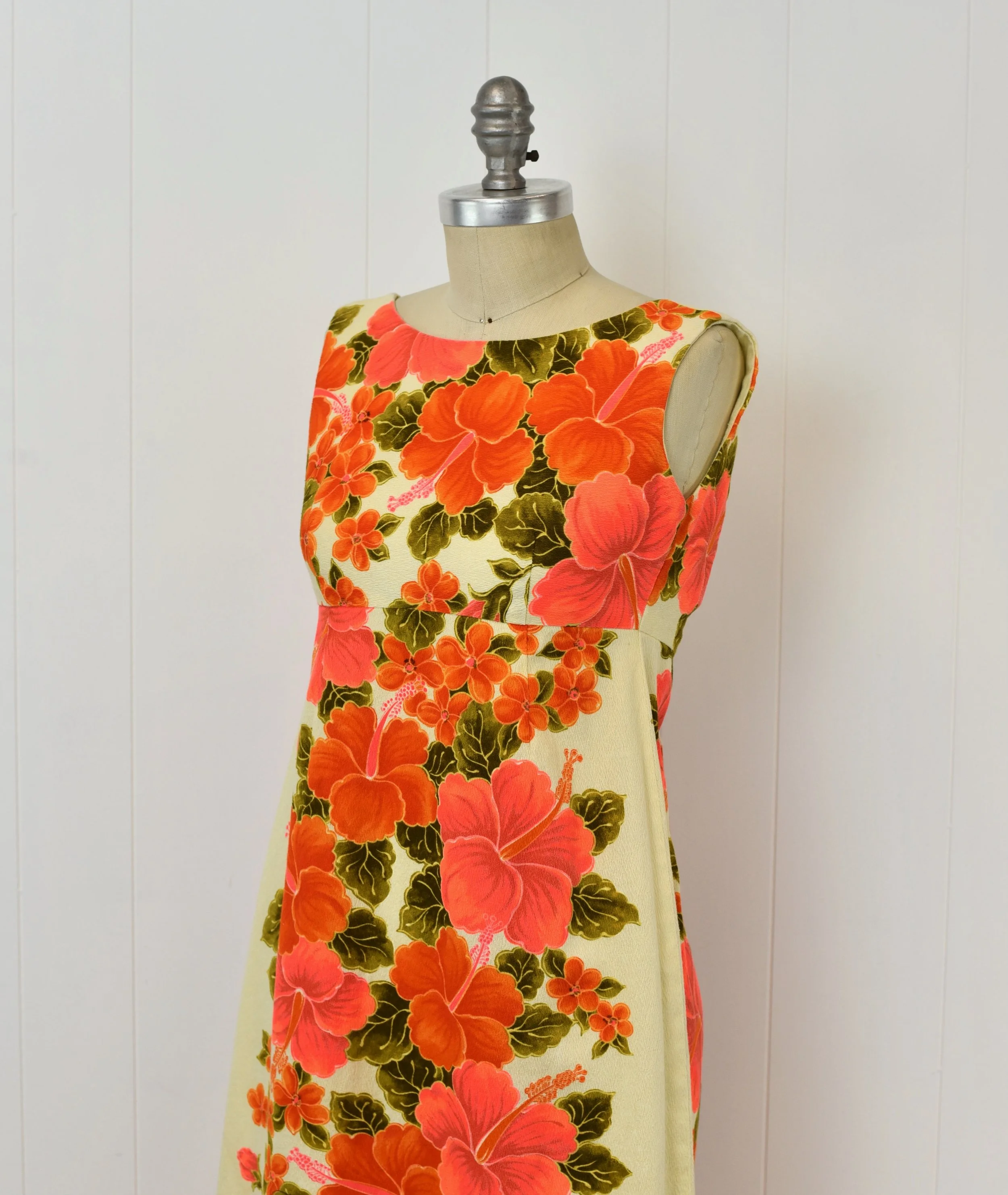 1960s Ui-Maikai Hawaiian Orange Green Hibiscus Floral Tiki Maxi Dress
