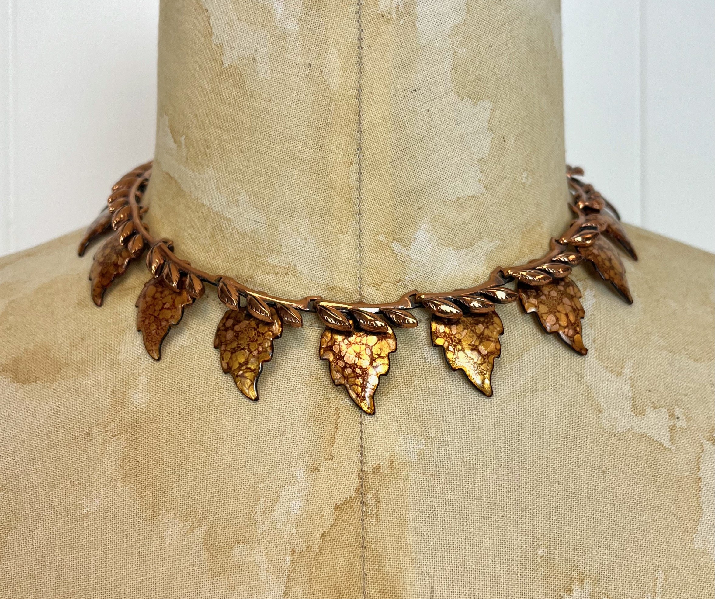 1950s Matisse Copper Enamel Leaf Novelty Mid Century Statement Necklace Earrings Brooch Pin Jewelry Set Signed