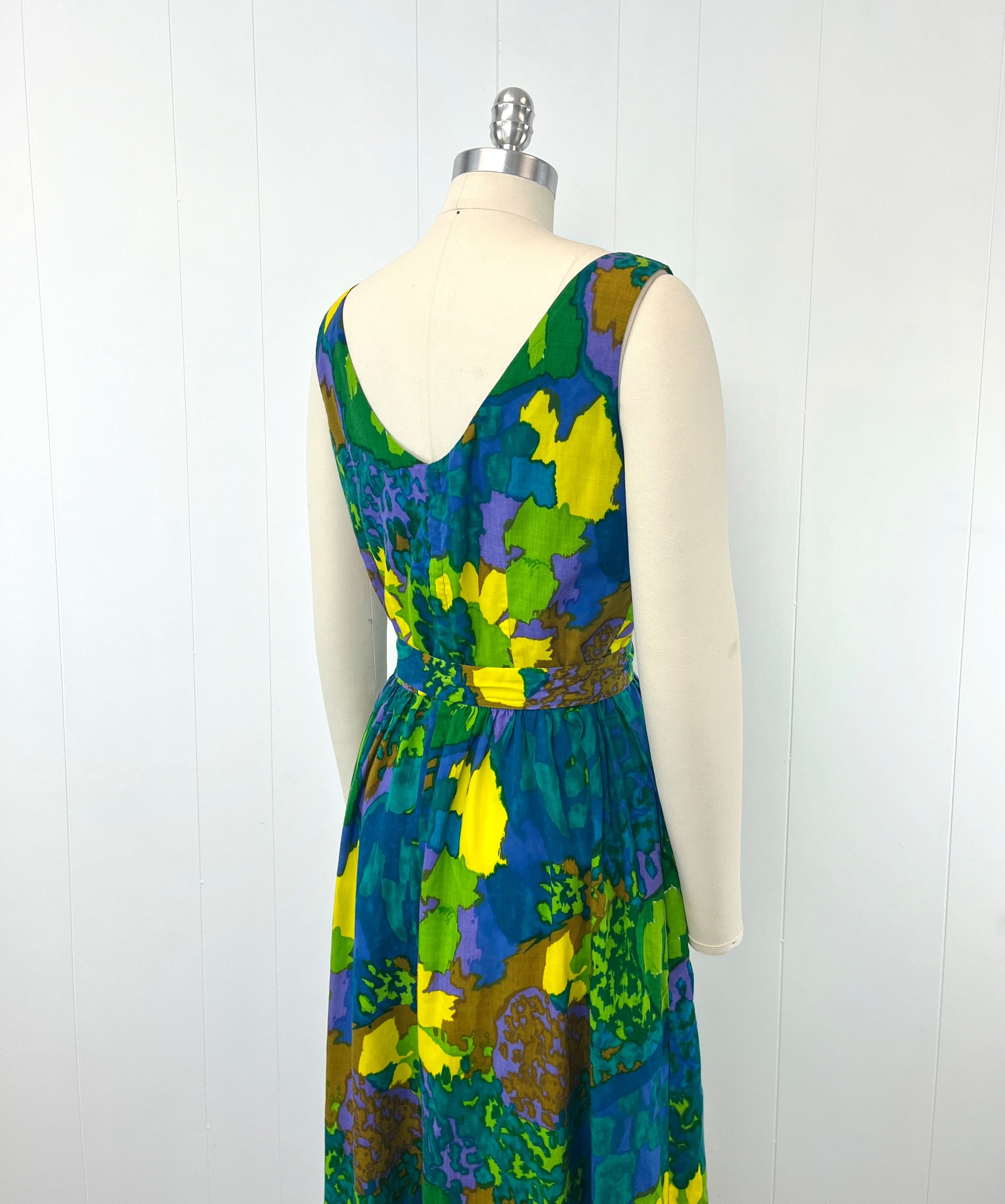 1960s/1970s Psychedelic Blue Purple Yellow Watercolor Abstract Floral The Kahala Honolulu Hawaiian Palazzo Pant One Piece Jumpsuit