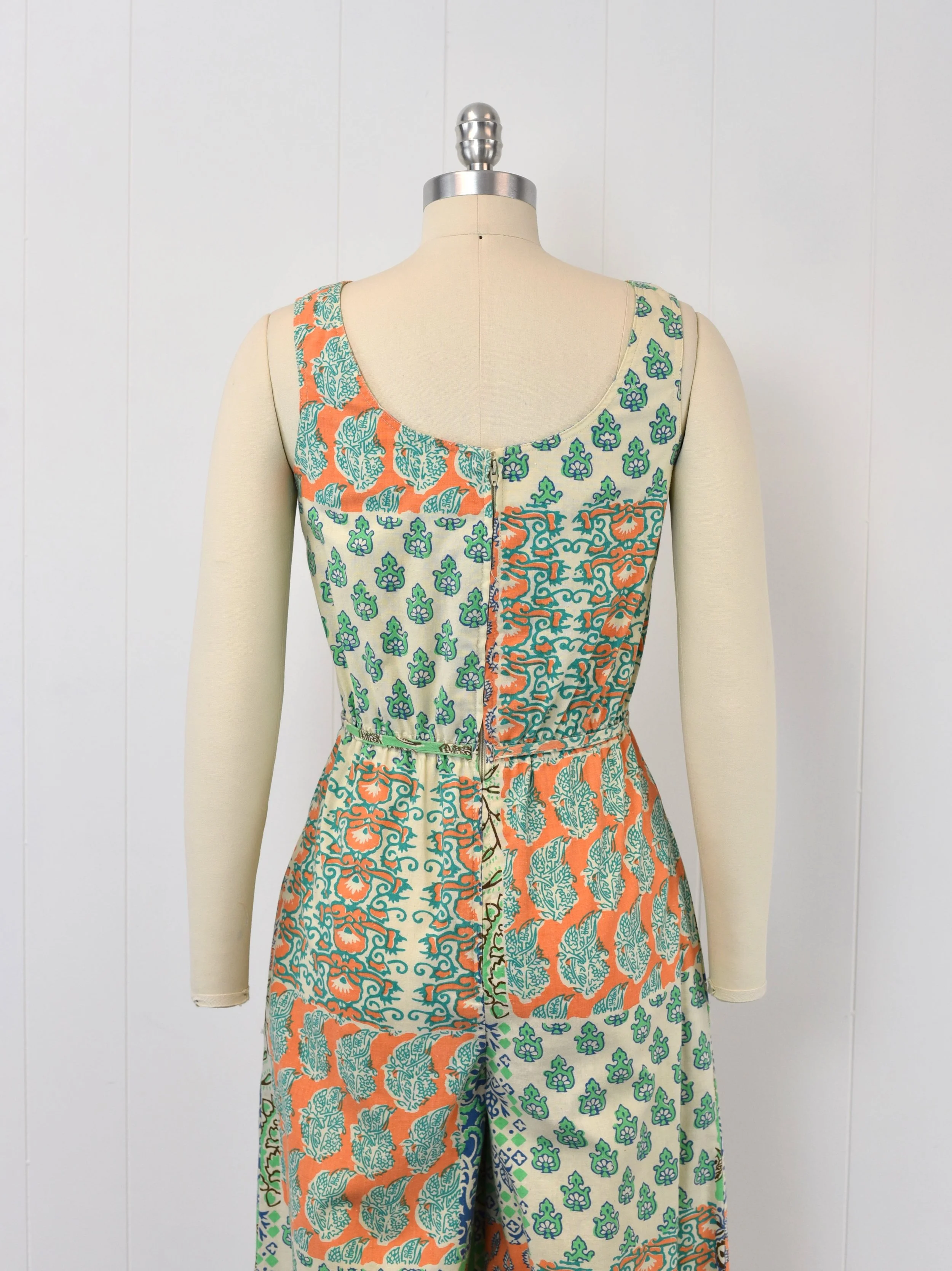 1970s Patchwork Paisley Floral Green Orange Cotton Boho Hippie Kappi Jumpsuit Shirt Matching Two Piece Set