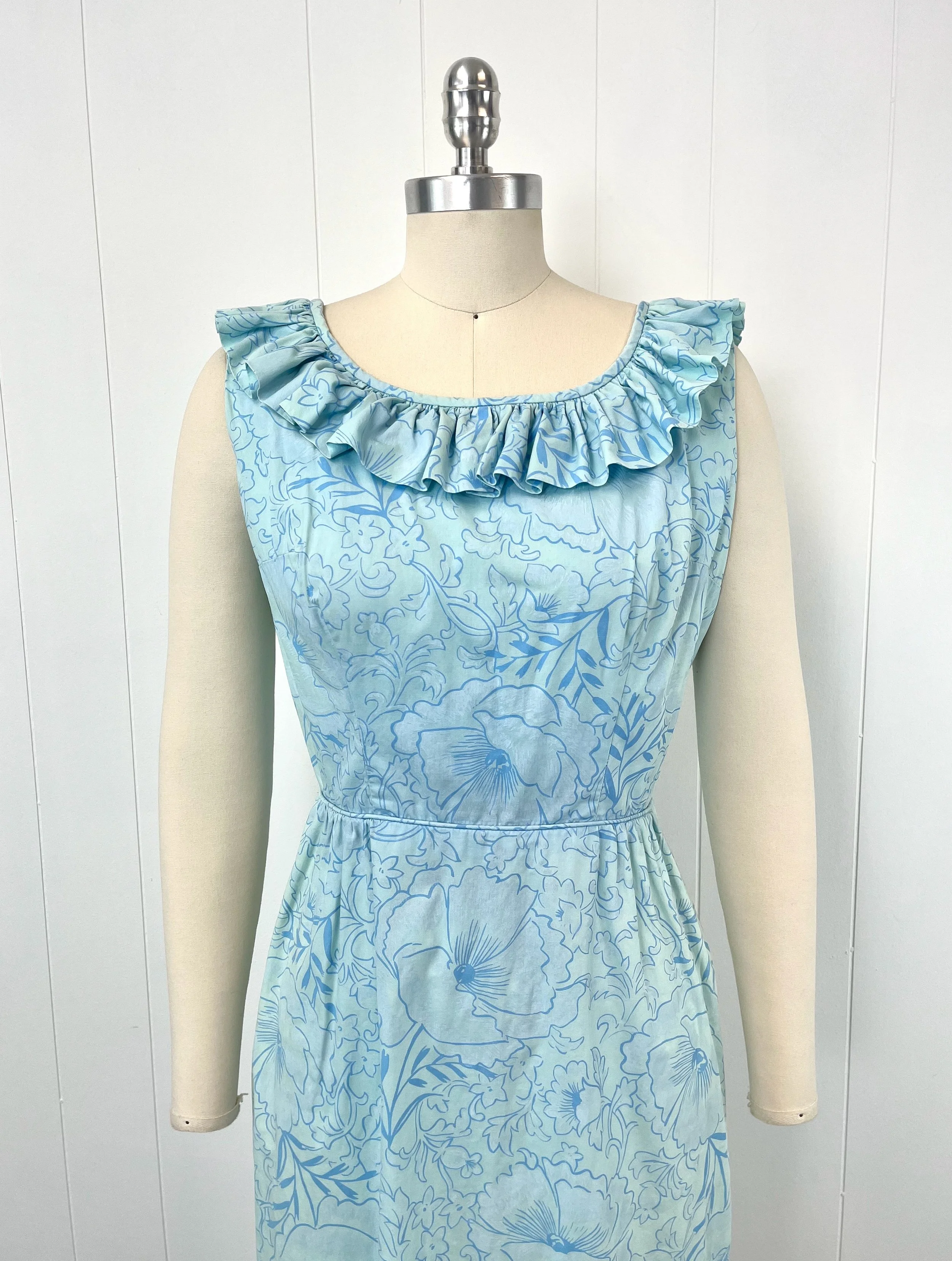 1960s Key West Hand Prints Blue Floral Ruffle Cotton Palm Royale Sundress Dress