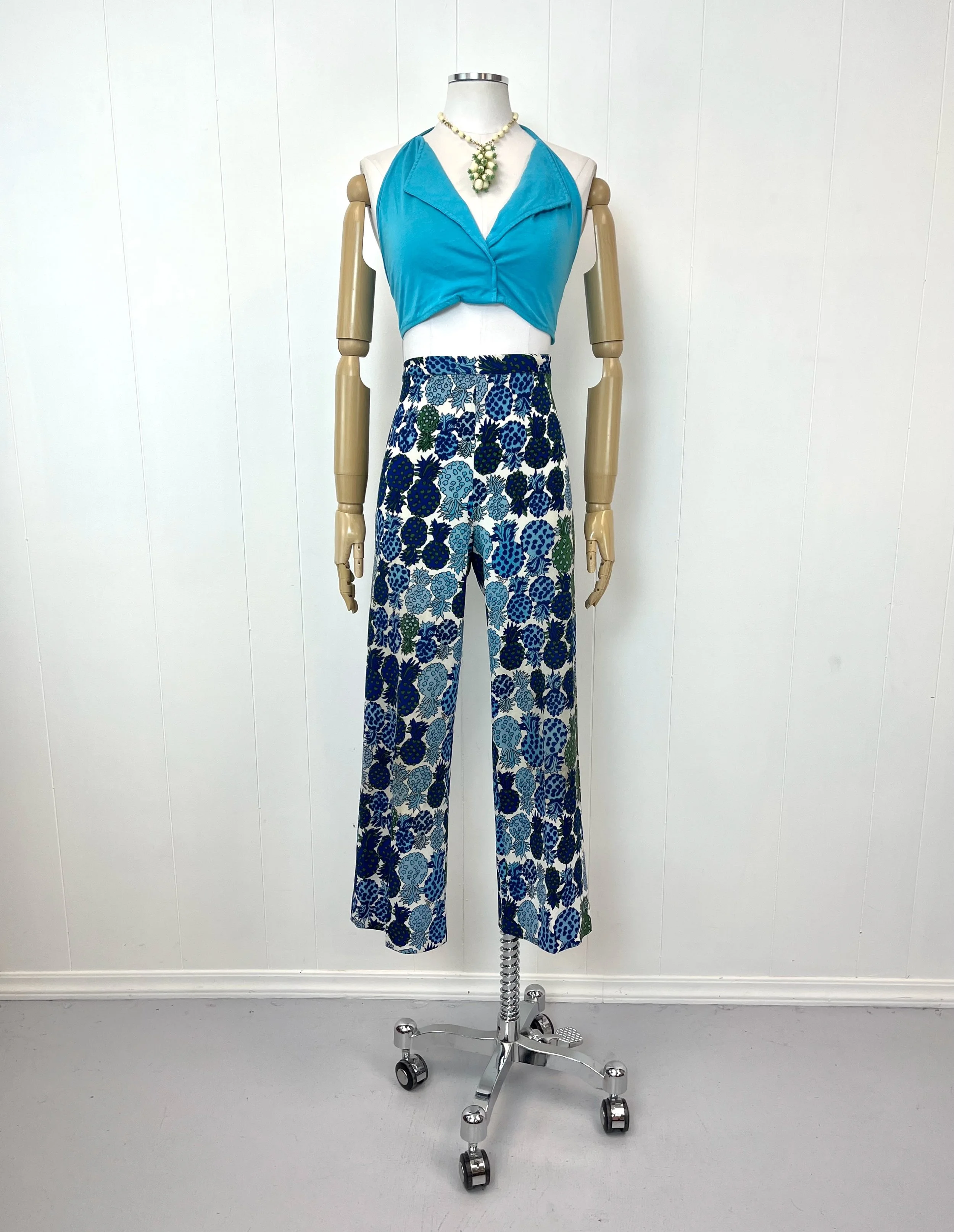 1960s/1970s Lilly Pulitzer Pineapple Novelty Print Blue Green Polyester Knit Pants Trousers