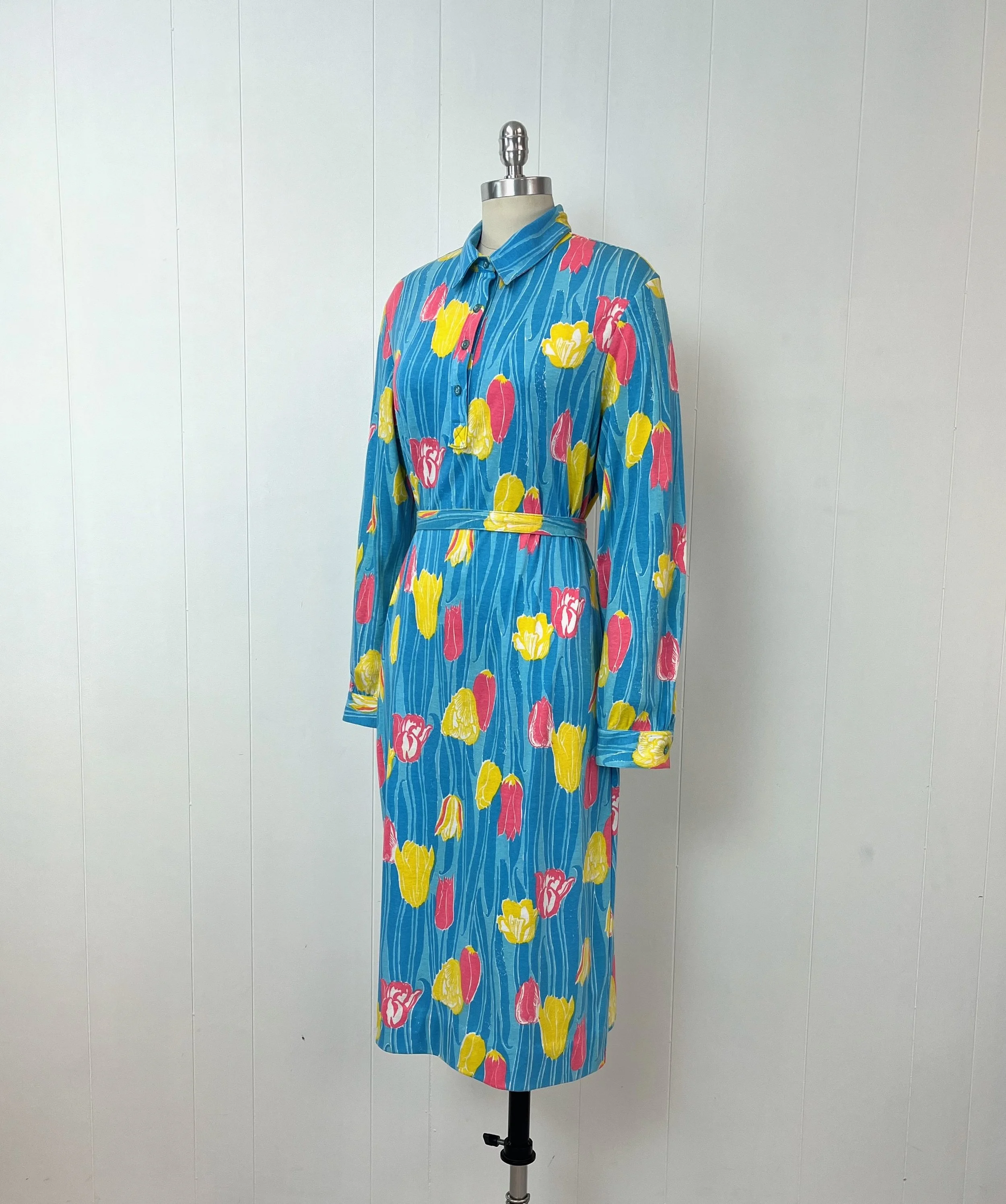 1980s Lilly Pulitzer Tulip Floral Print Blue Long Sleeve Shirt Dress with Matching Belt