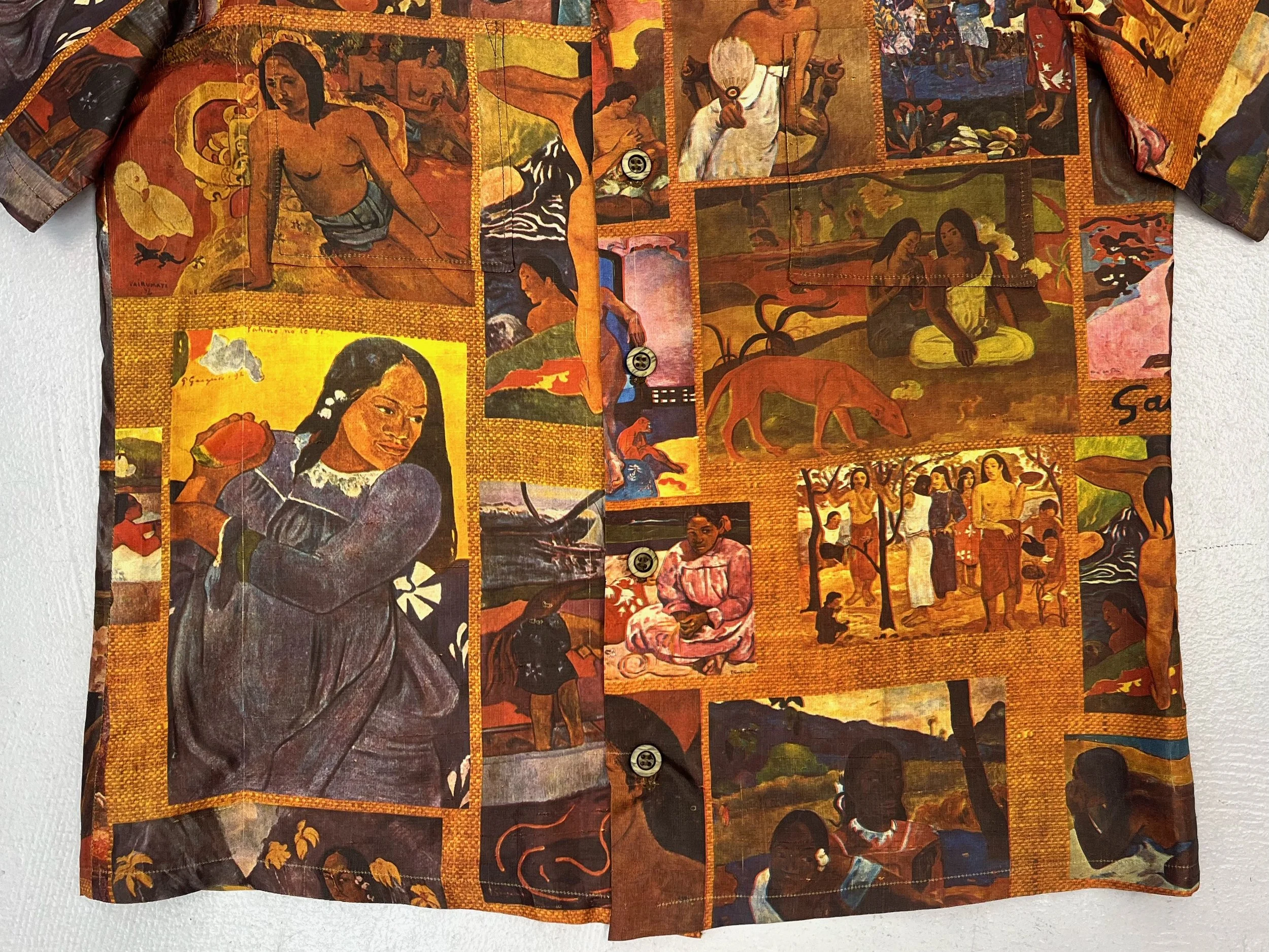 1970s Paul Gaugin Symbolist Art Novelty Print Hawaiian Mens Button Down Short Sleeve Shirt