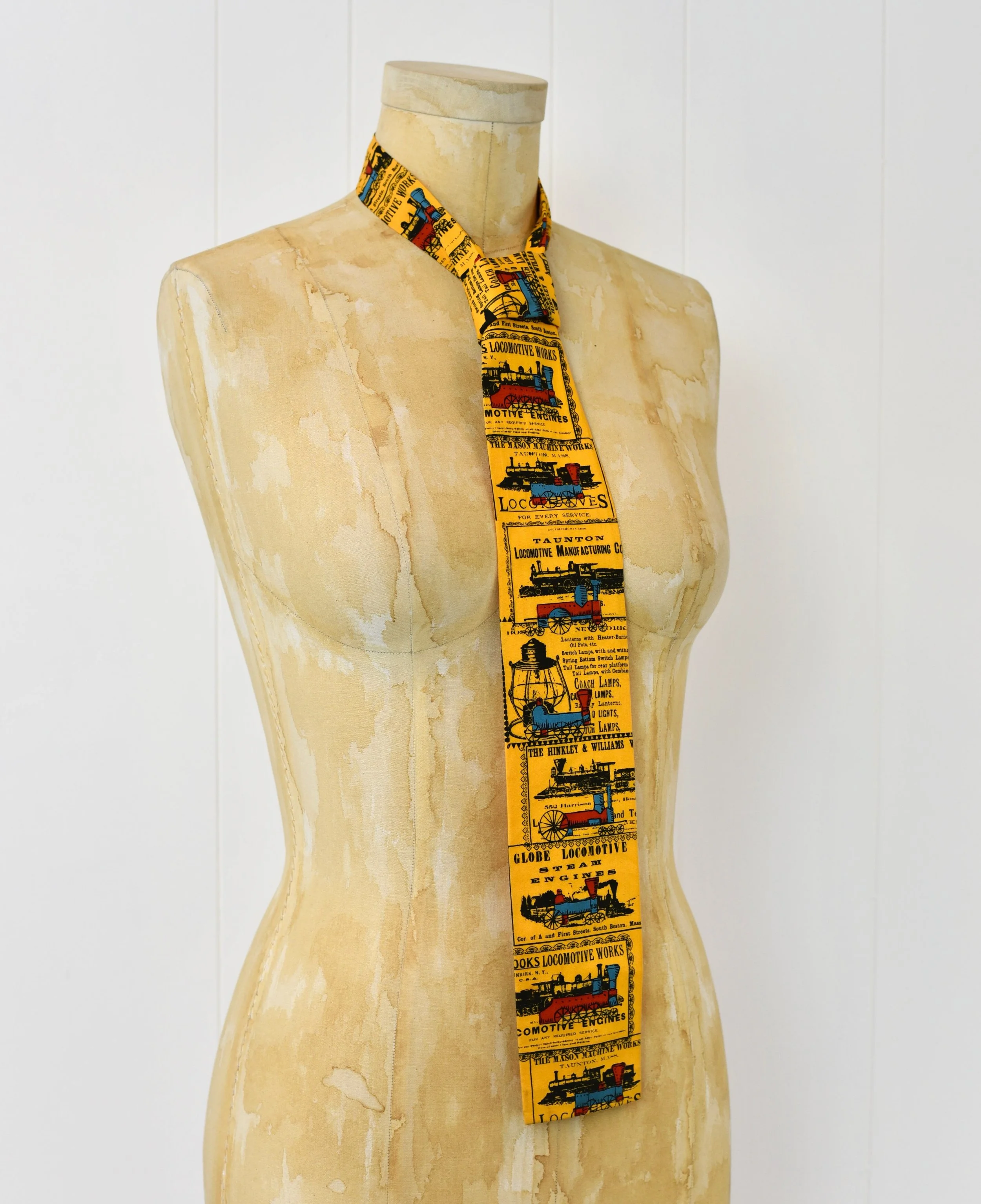 1960s Locomotive Train Novelty Print Yellow Gold Cotton Rooster by Sun Fabrics Mid Century Mens Neck Tie