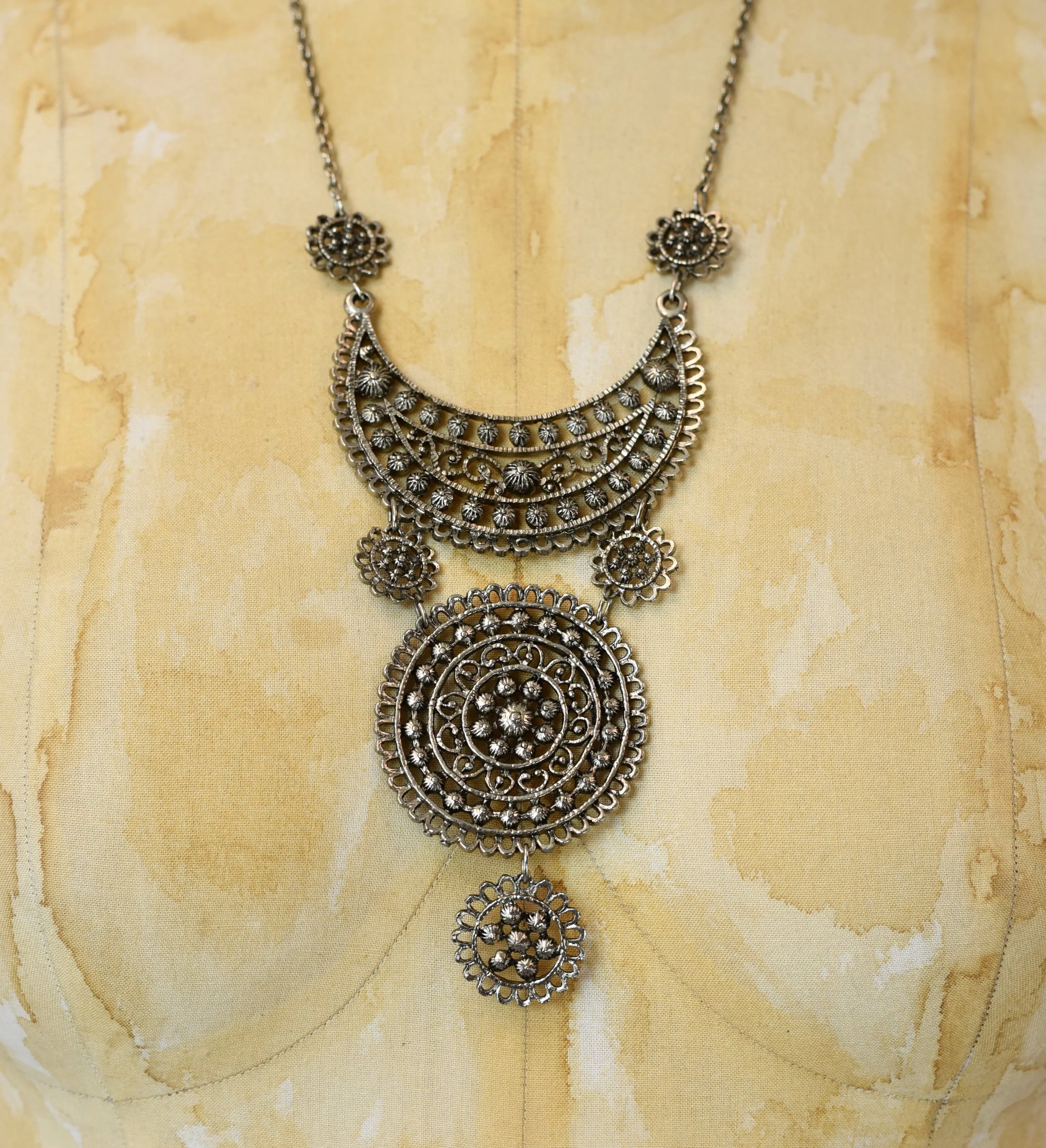 1970s Silver Toned Metal Floral Inspired Boho Statement Necklace Jewelry