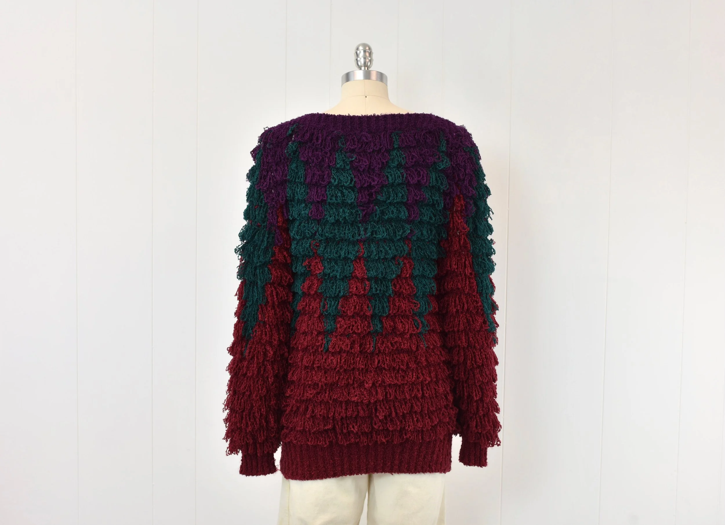 1980s Clovis Ruffin Harlequin Diamond Purple Green Red Looped Fuzzy Acrylic Pullover Sweater