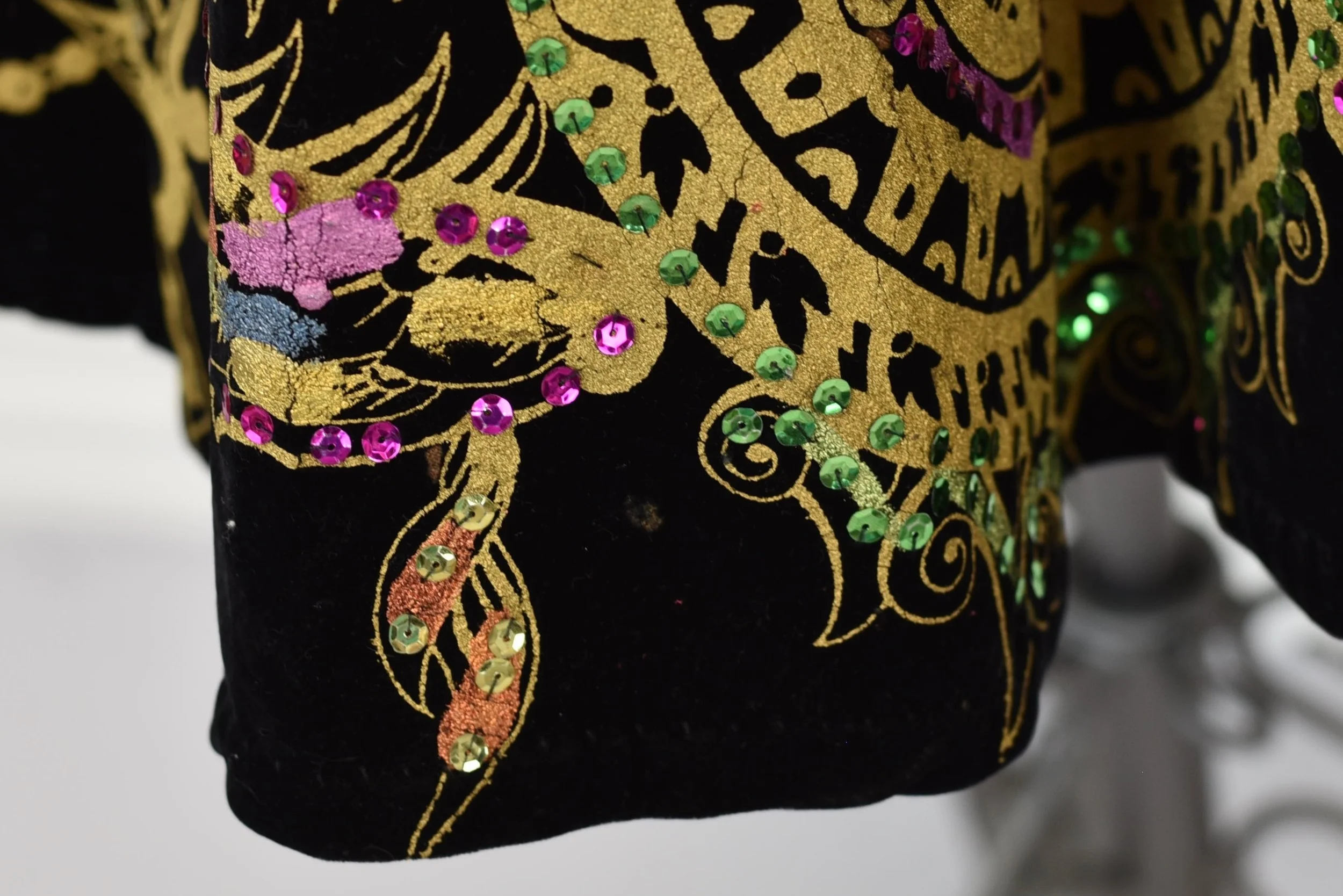 ♥ Condition: Very good vintage condition, structurally wearable as is. Various wear to velvet. Over time, some of the paint has become a little dry and cracked in which there are a few areas where paint is actually missing. Some minor patina to sequins with some missing and/or loose. Some scuffs to velvet including some indentations to waistband. Colors are still vivid and material is strong, this skirt still presents beautifully! Sold as is.