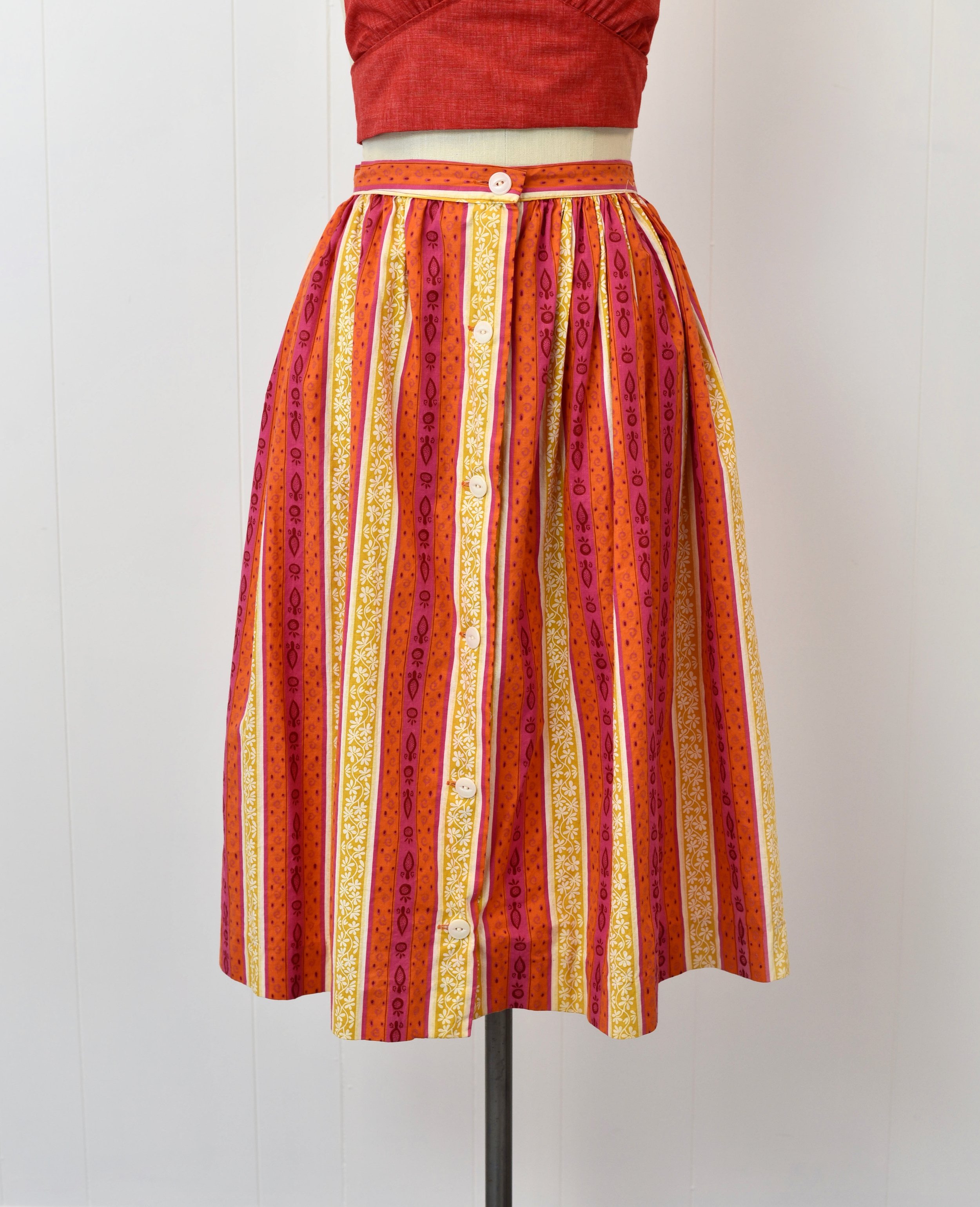 1950s Orange Pink Colorful Striped Floral Novelty Print Full Skirt