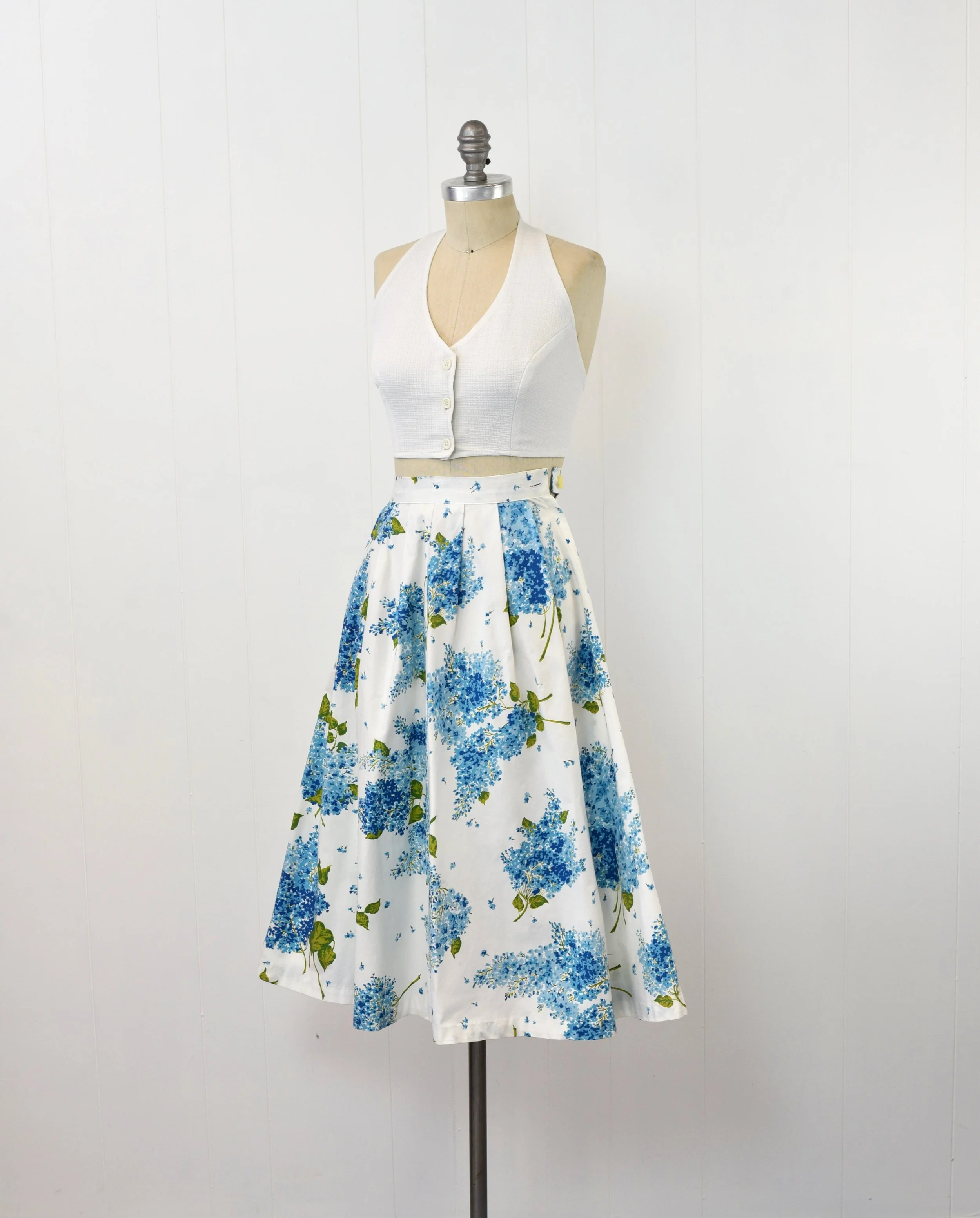 1950s White Blue Floral Bouquet Garden Paddle and Saddle Sportswear Pinup Mid Century Full Skirt
