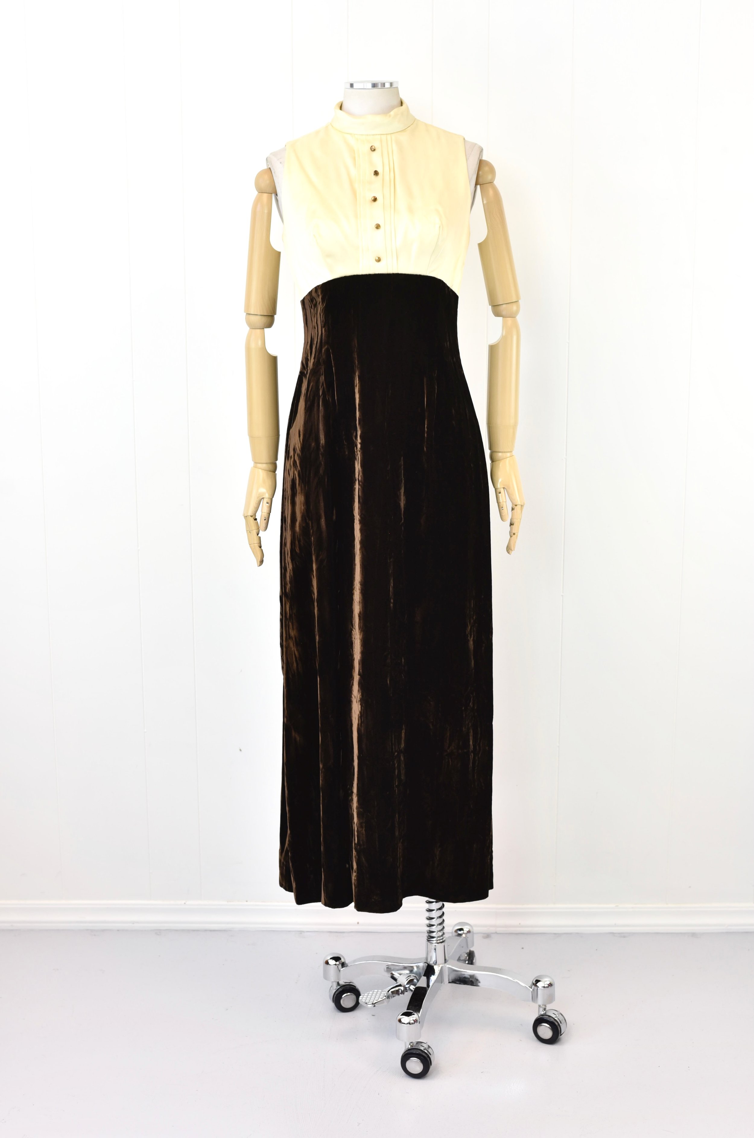 ♥ Condition: Good vintage condition, structurally wearable and sounds. The velvet has scuffs, marks, and wear. Some spots as well as patina to faux buttons. The collar of dress has cardboard “shape a neck” adhered to the interior. We have not tried to remove, though the corners have lifted. Sold as is.