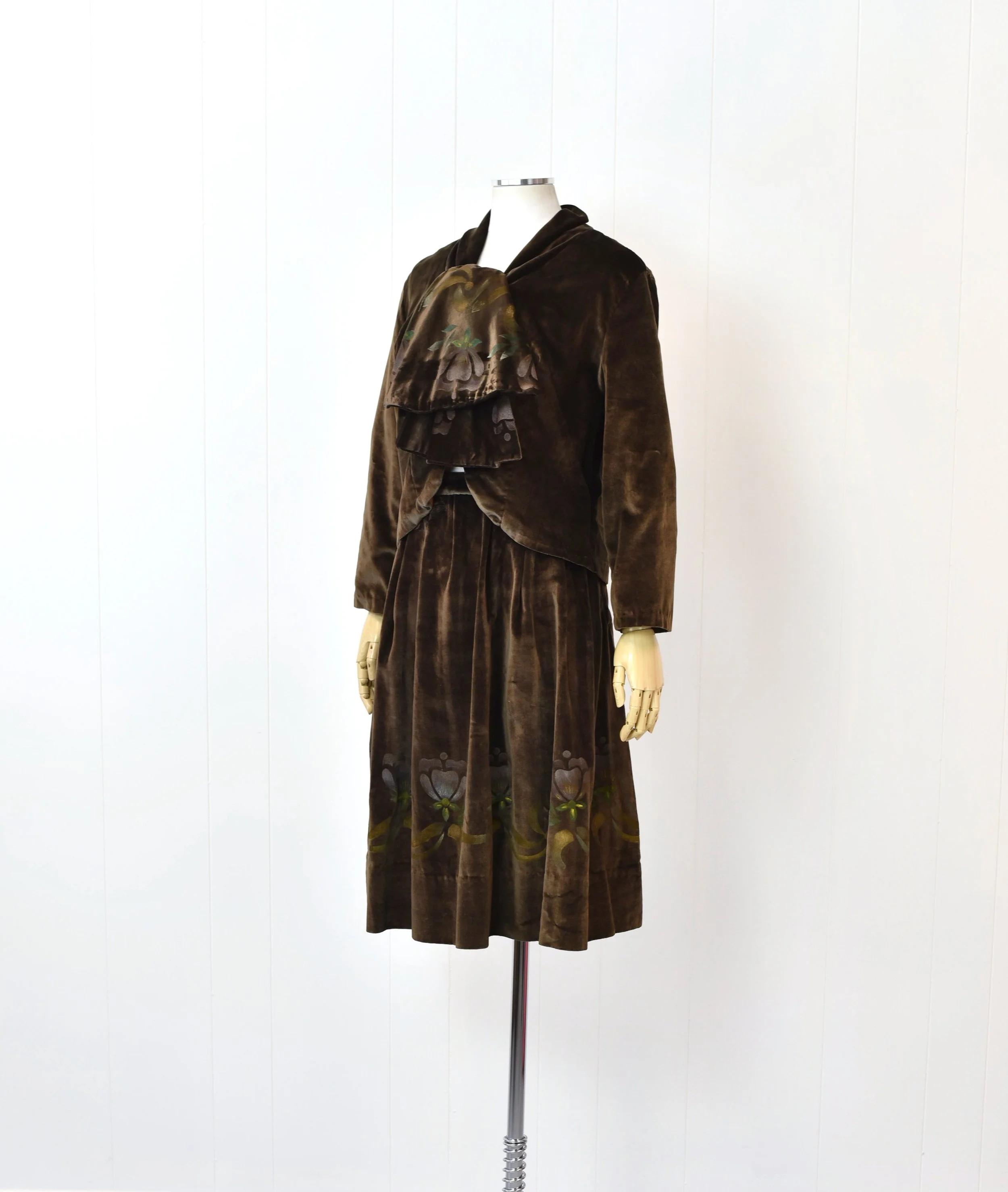 1960s/1970s Brown Velvet Floral Hand Painted Jacket & Skirt Two Piece Suit Set