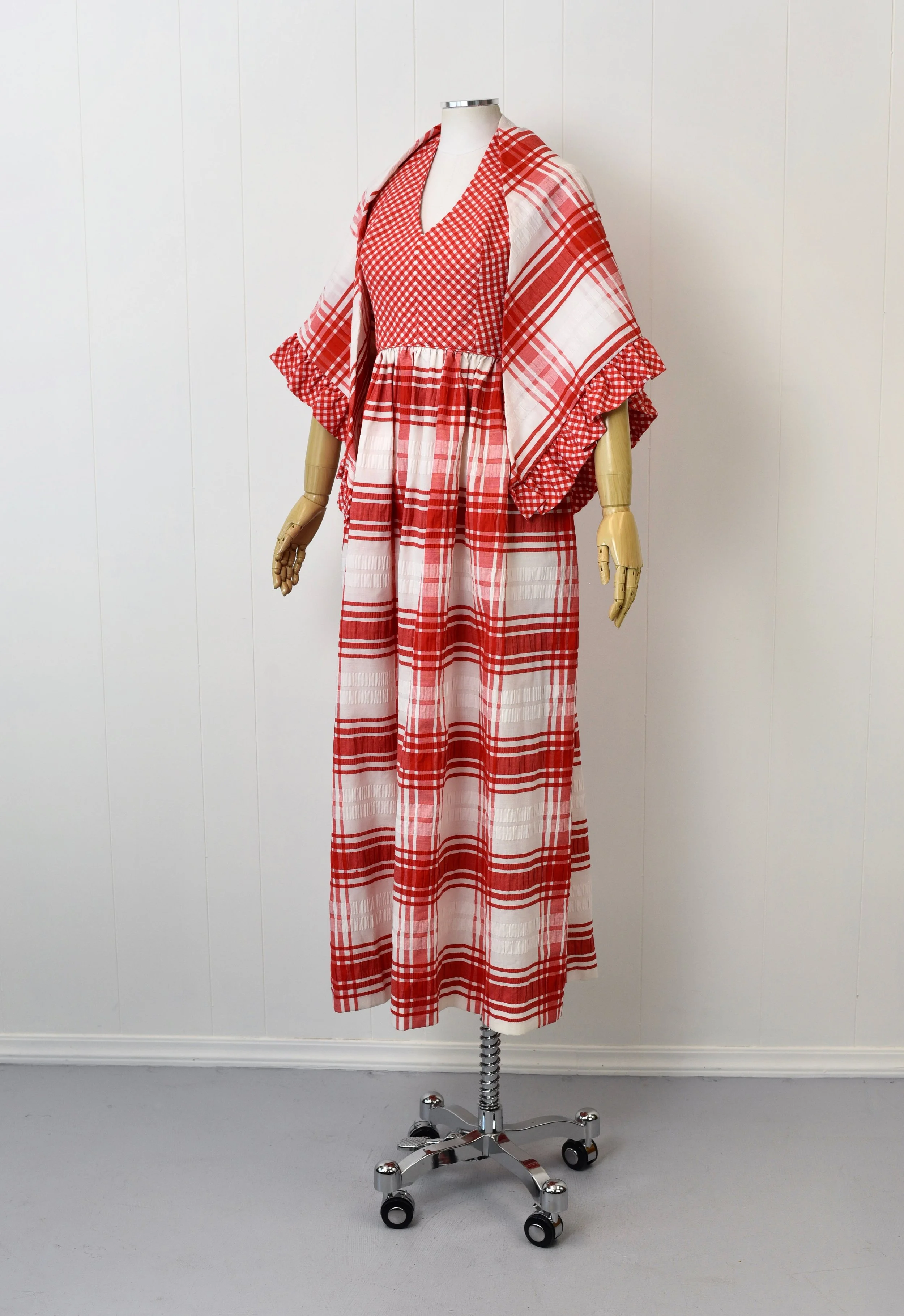 1970s Gingham Plaid Red & White Halter Dress with Matching Wrap Shawl