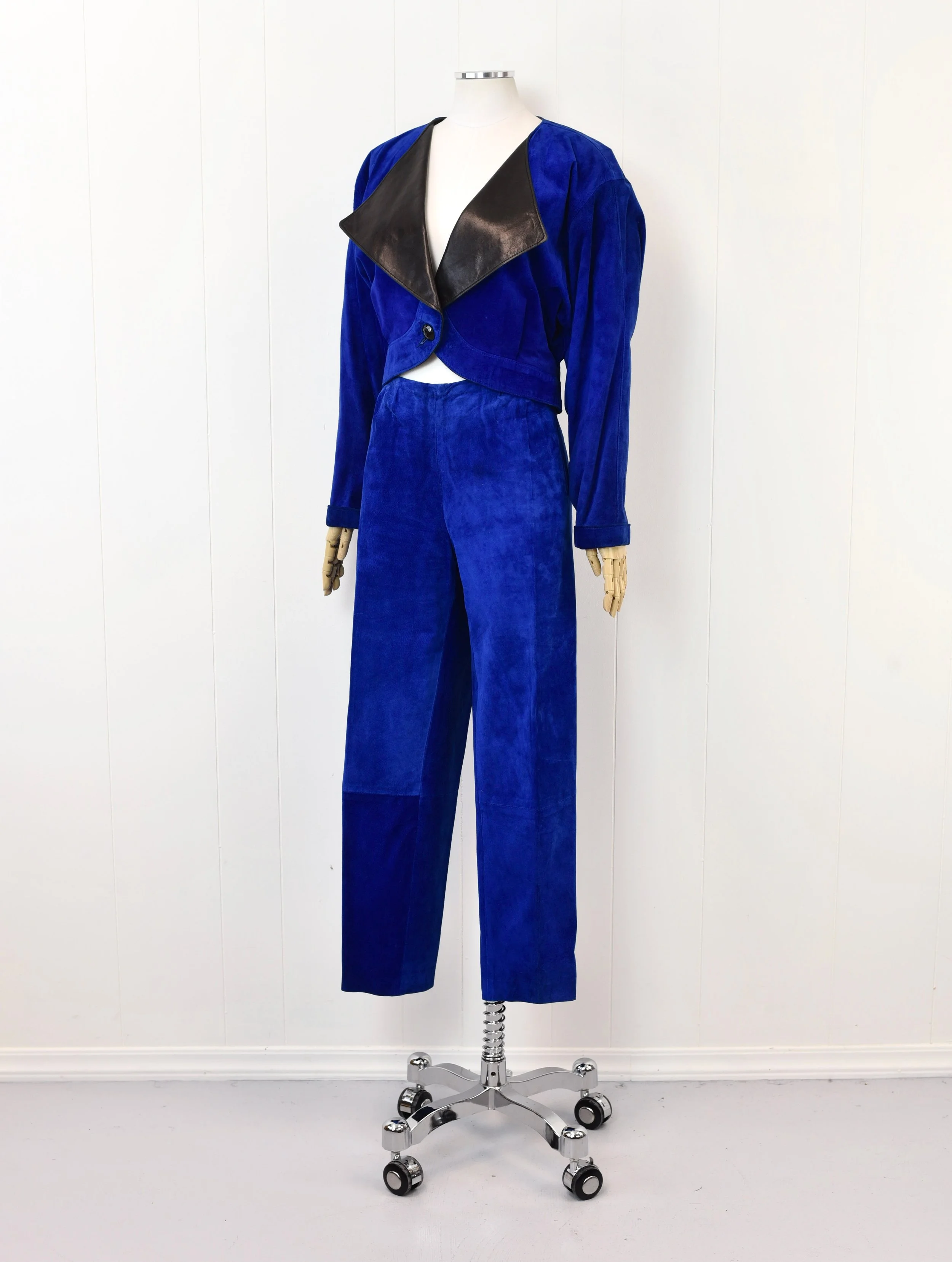 1980s Cobalt Blue Suede Leather Louis-Guy Giroux Jacket Pants Matching Two Piece Suit Set