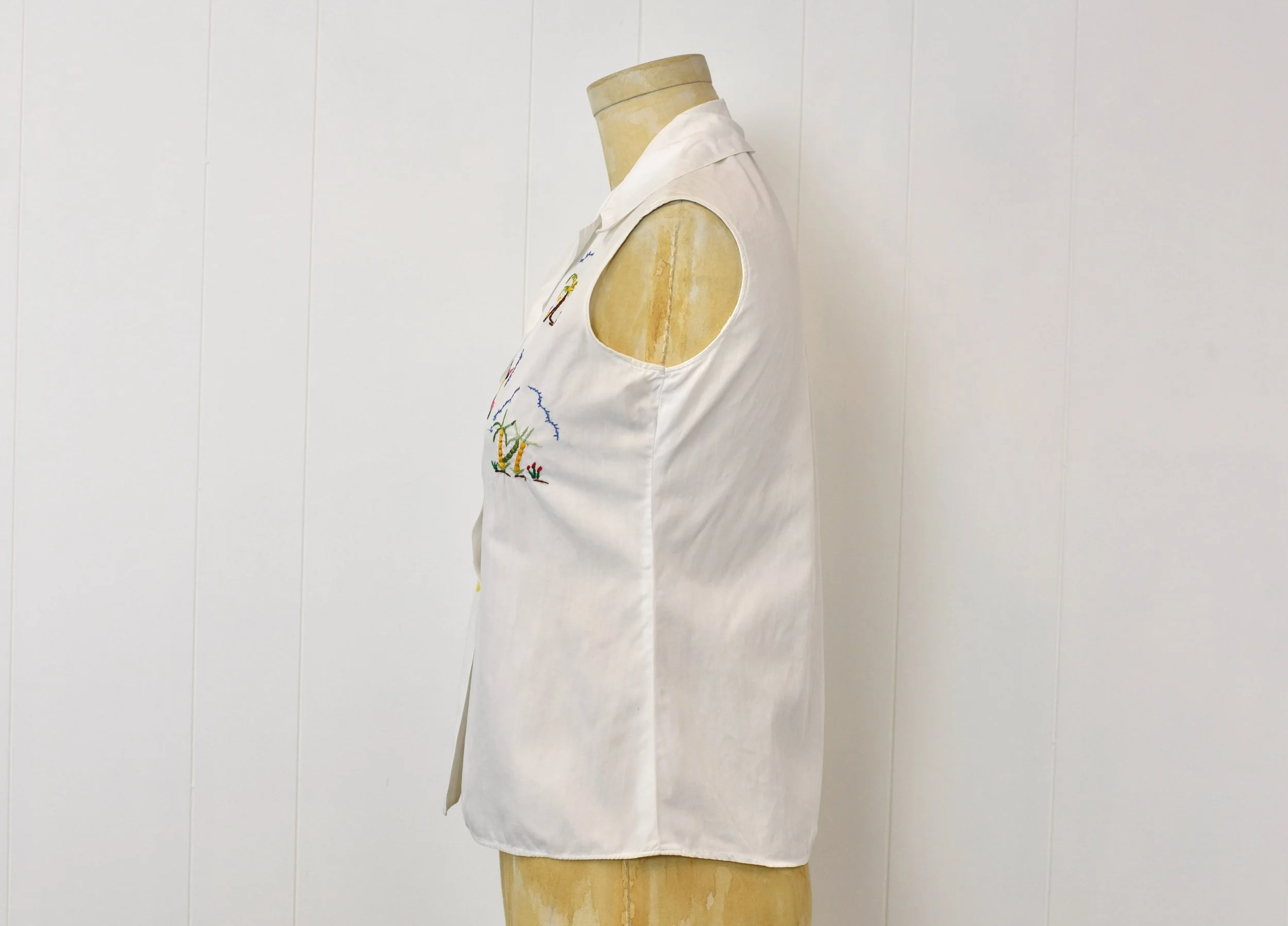 1950s Caribbean Islander Novelty Embroidered White Cotton Sleeveless Blouse Shirt Top